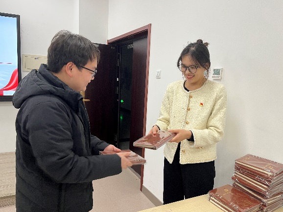 会后,51吃瓜 2022级博士生党支部书记李祥园向支部成员分发理论学习笔记本。