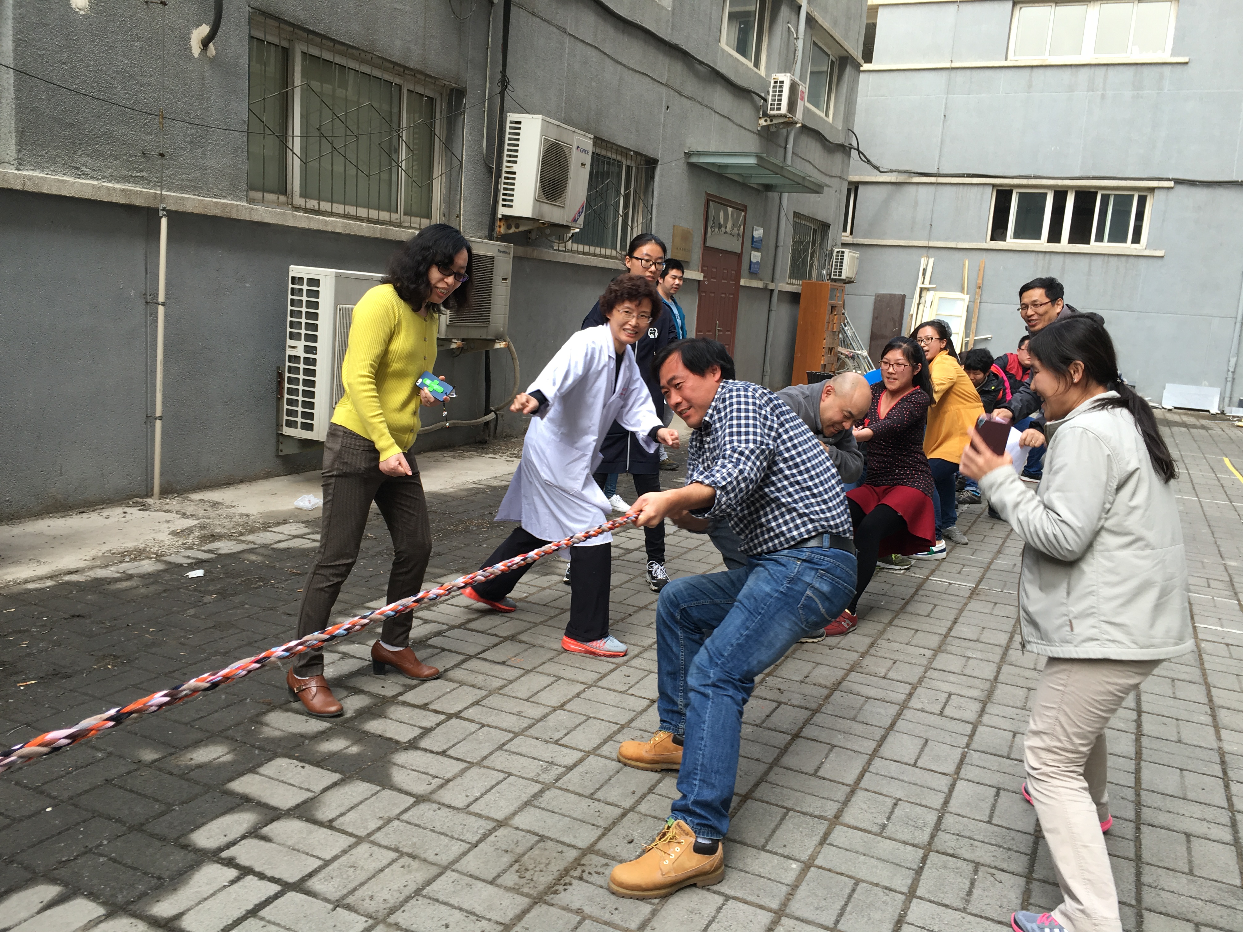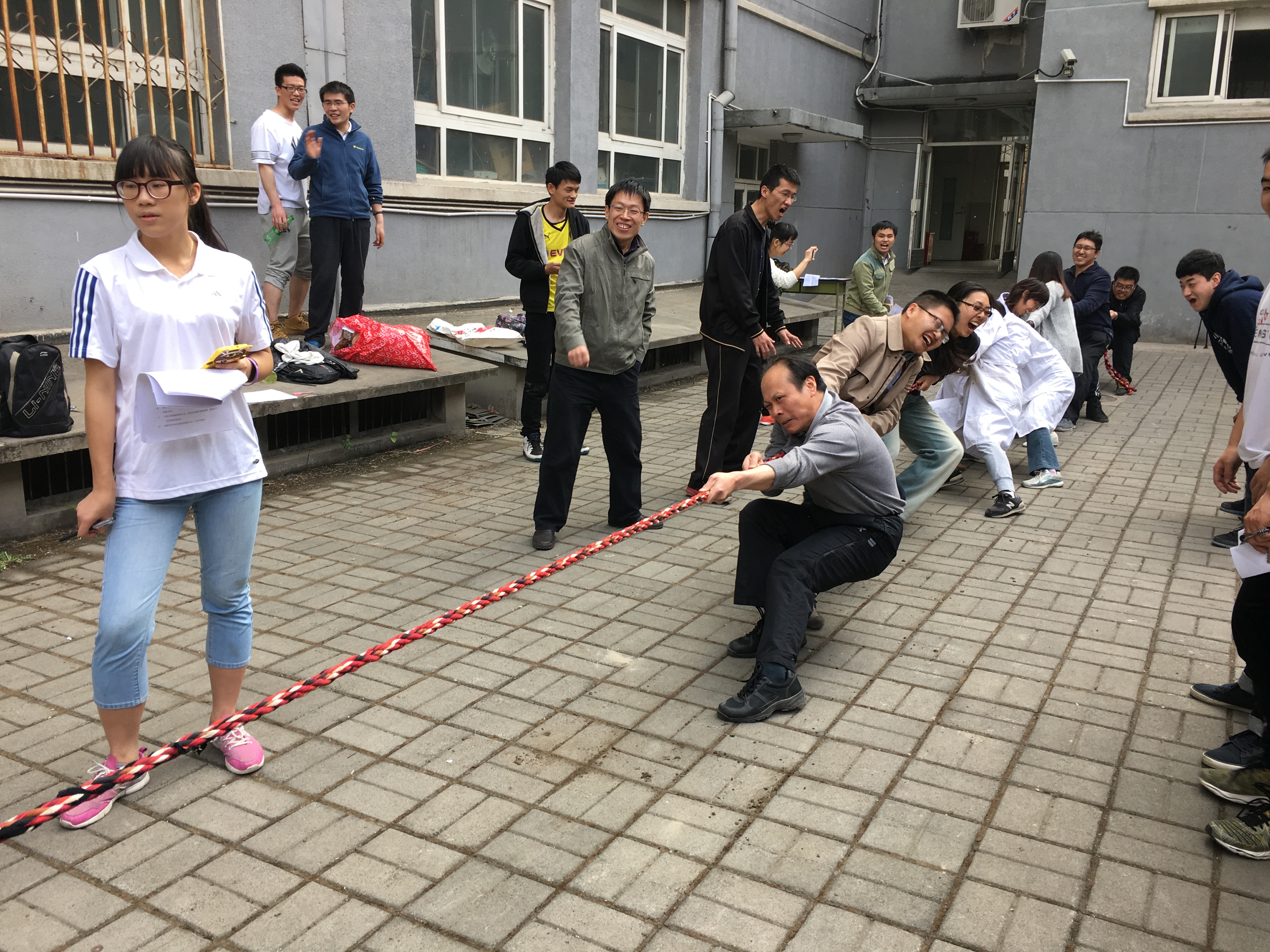 拔河比赛在学院的东小院举行。经过多轮激烈较量,无机和分析工会小组获得了冠军,2014级1班的同学获得了亚军,物化和量化工会小组获得季军。在号子和加油声中,拔河比赛为2016年51吃瓜