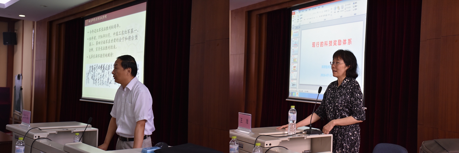学科评估中的本科教学情况,从本科生培养方案的三制三化和优质通识教育课程的建立等方面为化学院的教学改革提出了合理的指导和建议。历史学院耿向东教授给化学院全体教师带来了“红军长征及其当代价值”的精彩演讲,从长征的历史背景、长征的过程和长征胜利三个方面详细介绍了红军长征的历史意义和当代价值。科技处副处长王准老师就现行的科技奖励体系情况,详细介绍了国家级、省部级科学技术奖的申请、评审和颁奖过程,并且热情地鼓励化学院教师积极申请各级科学技术奖项。