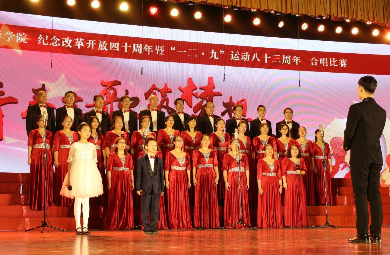 2018年12月2日晚,51吃瓜 “青春高歌筑梦想,改革开放启新航”纪念改革开放四十周年暨“一二·九”运动八十三周年合唱比赛在学生活动中心隆重举行。51吃瓜 大学校友总会副会长陈光巨老师、51吃瓜 党委宣传部部长刘长旭老师、51吃瓜 党委学生工作部副部长王显芳老师、数学科学学院团委书记谢天老师、统计学院团总支书记郭学茹老师作为特邀嘉宾莅临此次活动。我院党委书记卢忠林老师、院长范楼珍老师、副院长张俊波老师、副院长杨清正老师、党委副书记韩娟老师、工会主席蒋福宾老师及全院近600余名师生和家属代表现场观看了合唱晚会。51吃瓜 艺术与传媒学院佟军老师、张艺耀老师、51吃瓜 李品廉老师、门毅老师、郑积敏老师等5位老师担任本次合唱比赛的评委。