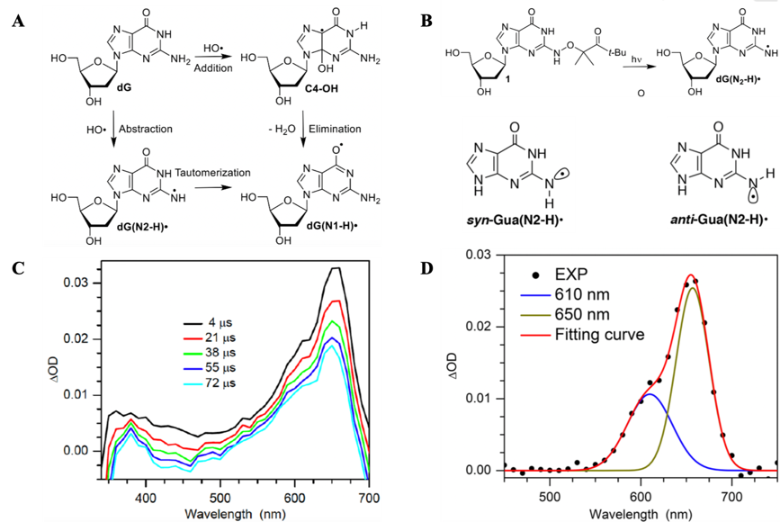 图A: OH•与G碱基反应生成dG(N1-H)•自由基的两种反应机制;图B:光诱导前体1生成dG(N2-H)•及自由基的anti-和syn-两种构像; 图C: 激光光解典型时刻的瞬态紫外-可见吸收光谱; 图D: 吸收峰分别在610 nm和650 nm的高斯线型拟合anti-和syn-构像的dG(N2-H)•瞬态吸收光谱。