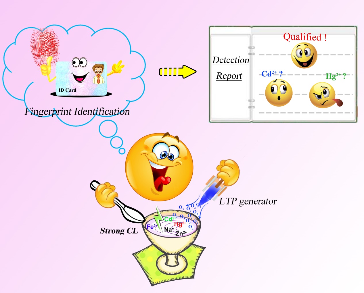 碳量子点纳米材料由于其制备简单、生物相容性及荧光抗漂白性好等特点,受到了广泛关注。低温等离子体(LTP)是基于介质阻挡放电产生的一种由多种高能态粒子组成的高化学活性的气体,在离子化、表面处理、辅助催化等领域发挥了积极作用。那娜老师课题组研究发现,将LTP气体导入到碳量子点溶液中时,会快速引发强烈的化学发光现象,同时伴随着碳量子点溶液的荧光发射波长红移和强度减弱现象;通过UV、FL、IR、XPS等表征分析及理论计算,推断该过程是由于臭氧在C=C上发生氧加成反应,生成高能态的氧化性碳量子点,当其由激发态回到基态的同时产生强烈的化学发光现象。此外,该类化学发光信号会随着不同金属离子的存在而会改变,并且发现该变化随着碳量子点和金属离子种类不同而不同。因此,利用这种交互响应信号构建了新型化学发光阵列,实现了多种金属离子的快速识别。