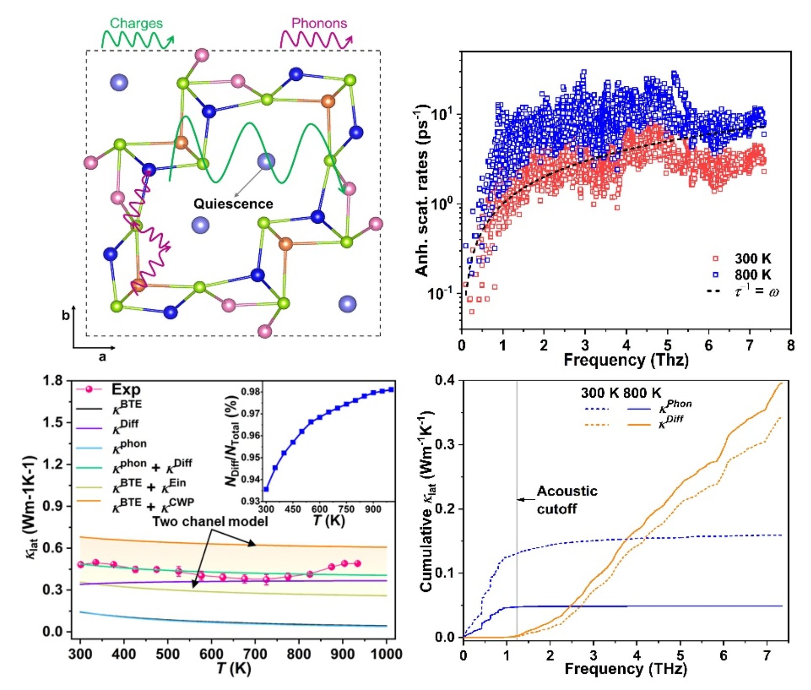 热电转换技术能够实现热能与电能之间的直接可逆转换,在废热回收利用和固态制冷等领域具有一定的应用价值。热电材料的晶格热导率是唯一独立的热电参数,对其微观机制的深刻理解对于寻找高热电优值的新材料具有重要意义。一般来说,晶格的热流载体是声子波包,其扩散和散射可以像气体分子一样,在三阶近似下用Peierls-Boltzmann输运方程(PBTE)很好地定量描述。基于PBTE理论,由于低声学截止频率、类液态离子迁移和非相干振动等原因,一些含铜/银的硫属化合物具有极低的晶格热导率。但是由于其晶体结构复杂、非谐性高、声子群速度低,该类化合物的晶格振动并不符合传统的声子气理论,如:部分振动模的平均自由程小于晶体结构中的最短原子间距,因此,如何合理地阐释该类化合物的晶格热输运具有挑战性。