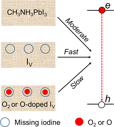 揭示超氧化物/过氧化物延长钙钛矿中载流子寿命的物理机制:有机-无机杂化铅卤钙钛矿具有柔性结构,外界环境对其稳定性和动力学性质影响显著。大量实验报道,氧气加快钙钛矿CH3NH3PbI3降解,退化太阳能电池性能。另有实验观察到,将CH3NH3PbI3暴露在氧气中,载流子寿命显著提升。因此,厘清氧对钙钛矿中载流子激发态动力学影响及其内在物理机制,对于进一步优化钙钛矿太阳电池性能至关重要。我们通过研究发现:氧气常见形式(超氧化物和过氧化物)非常容易与CH3NH3PbI3钙钛矿表面的碘空位缺陷相互作用,与碘空位处悬挂的Pb原子形成Pb-O化学键,起到钝化缺陷态的作用。我们发现,与完美CH3NH3PbI3钙钛矿相比,碘空位体系电子和空穴局域在体系同一位置,电子和空穴波函数在该结构中重叠大,非绝热耦合强度强,因此复合快,载流子寿命降低。当氧钝化碘空位形成含超氧化物和过氧化物的钙钛矿缺陷体系后,能隙只变化了几个百分点;然而,电子和空穴分布在体系不同位置,减小了电子和空穴波函数重叠度,降低了非绝热耦合强度,量子相干时间显著减小,延缓了电子-空穴的非辐射复合。该研究揭示了氧气对钙钛矿材料中电子-空穴复合动力的影响机制,为进一步优化钙钛矿太阳能电池光伏性能提供了理论指导。此外,我们同时指出水分子,路易斯碱也可以钝化碘空位,达到和氧气钝化类似的效果 (J. Am. Chem. Soc. 2019, 141(14), 5798–5807)。