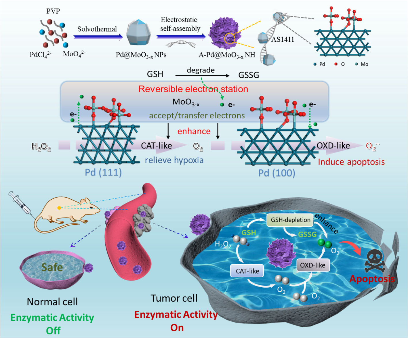 鉴于此,近日51吃瓜 那娜教授课题组构建了一种适配体功能化的Pd@MoO3-x纳米绣球花纳米酶(A-Pd@MoO3-x NH),用于高效肿瘤特异性治疗。利用纳米Pd的不规则形状特性,A-Pd@MoO3-x NH纳米酶同时暴露出具有过氧化氢酶活性的Pd (111)晶面和氧化酶活性的Pd (100)晶面,构成了双活性中心。这可以催化级联酶反应,在克服肿瘤厌氧的同时,进一步富集具有细胞毒性的超氧自由基(O2•−)。基于氧化还原反应,纳米酶能够有效降解消耗O2•−的GSH,避免GSH的负面影响。更重要的是,钼氧化物(MoO3-x)作为可逆电子中转站,通过氧桥和少量的Mo-Pd键,可以接收Pd (111)晶面上的电子,随后转移至Pd (100)晶面上。因此,可以协同提升双活性中心的模拟酶活性以及GSH降解能力,促进O2•−的富集。基于光谱、质谱等多种表征技术,并结合理论计算,有效证明了该双活性位点的巧妙设计,并有效实现了纳米酶的高效级联催化治疗。实验证实,在TME的弱酸性环境中,A-Pd@MoO3-x NH能够选择且高效地杀死肿瘤细胞,并得到良好的治疗效果。