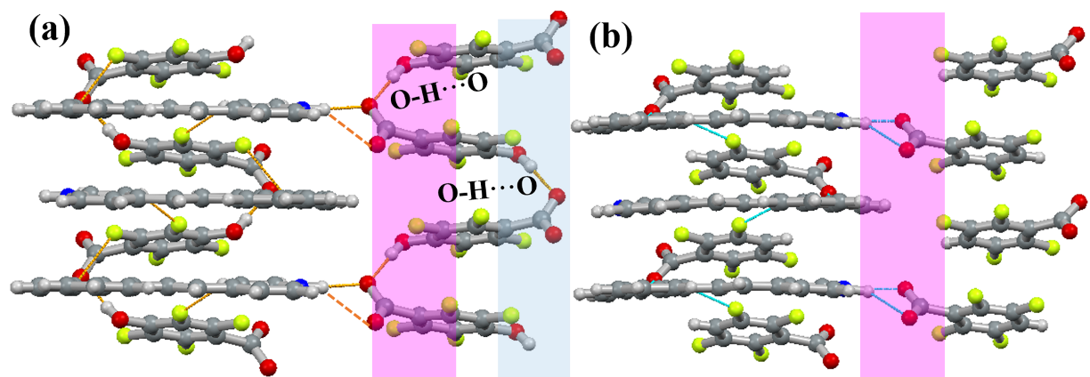 图2. (4-(1-萘乙烯)吡啶)与2,3,5,6-四氟-4-羟基苯甲酸共晶和(4-(1-萘乙烯)吡啶)和2,3,5,6-四氟-苯甲酸共晶不同的氢键作用力。