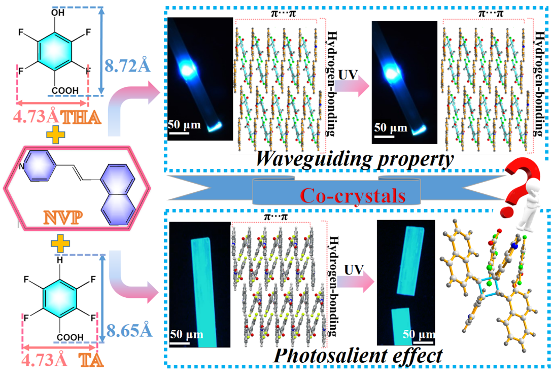 图1. 4-(1-萘乙烯)吡啶分别与两种共组装单元 2,3,5,6-四氟苯甲酸,2,3,5,6-四氟-4-羟基苯甲酸形成的分子共晶以及表现出的不同光刺激响应行为。