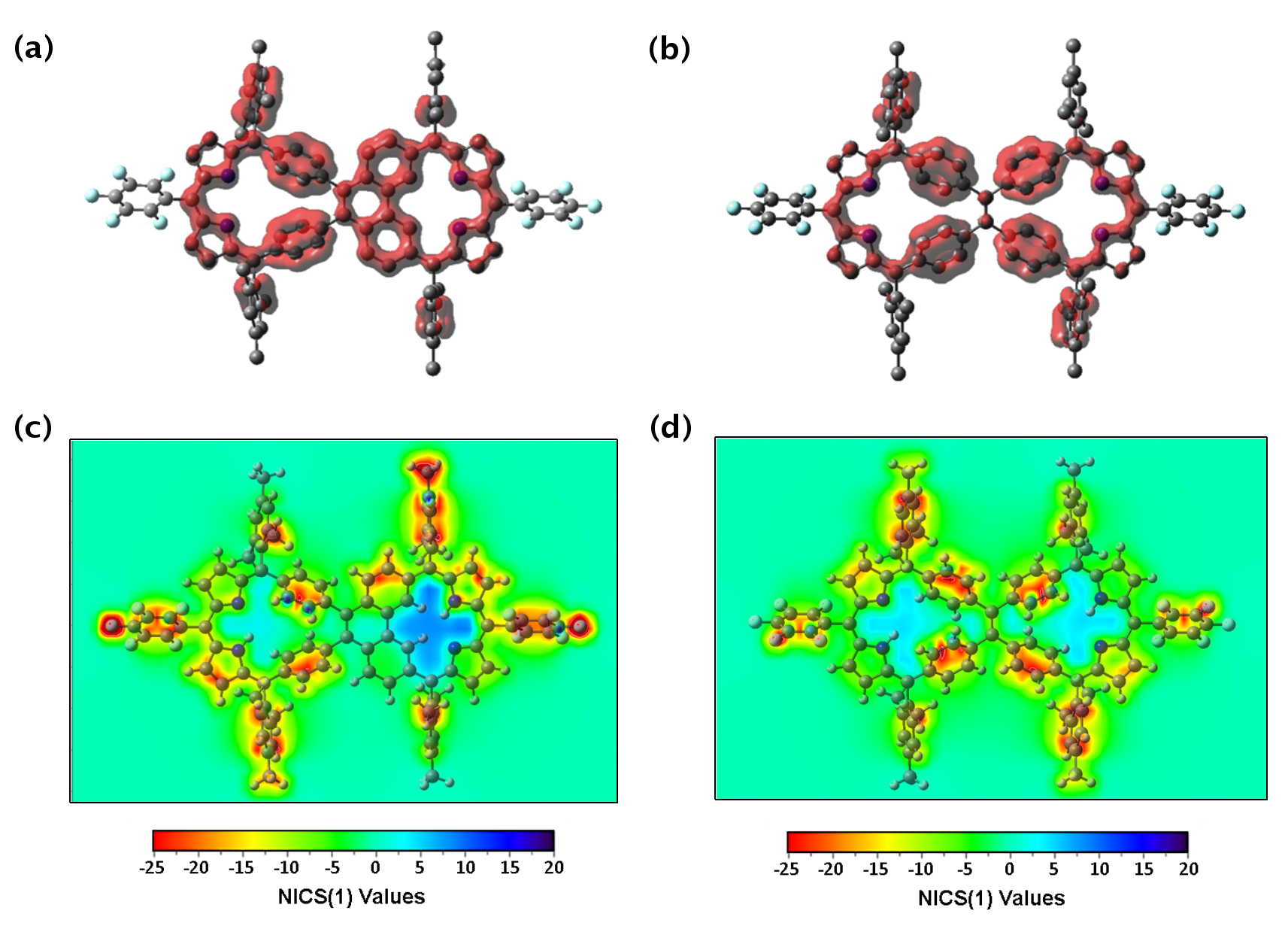 图2. Janus碳杂卟啉伪二聚体和双边未稠合的对称二聚体的EDDB图和NICS 2D图。