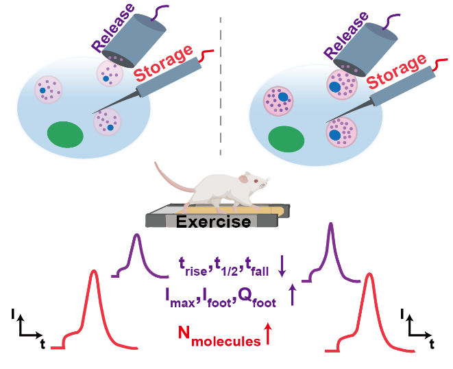 运动作为一种高效且非侵入性的生理调控策略,在改善认知功能及延缓神经退行性进程方面具有显著作用。大脑功能的实现依赖于精密的化学传递过程,其中由突触囊泡介导的神经递质量子化释放,构成了神经信息传递化学基础。尽管传统研究方法(如微透析取样和活体原位测量技术)已在整体动物和脑片层面发现运动能够有效提升神经递质的释放水平,但运动如何在单个囊泡尺度上调控递质储存、融合孔开闭动力学等量子释放关键环节,目前仍不清楚。因此,深入探索运动对囊泡化学过程的调控作用,从化学信号基本单元层面系统阐释运动改善脑功能的分子机制,对于揭示运动调控神经功能的化学基础具有重要的科学意义。