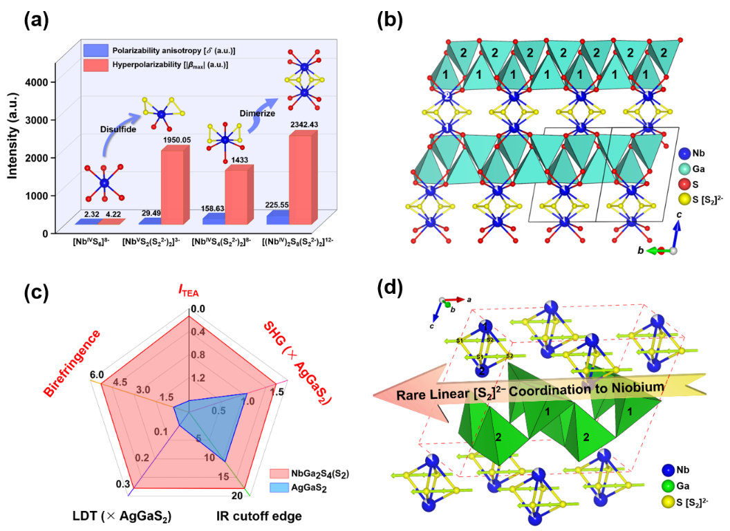 吴立明、陈玲课题组长期深耕硫属化合物研究,在多硫化合物探索研究方面也颇有建树,他们通过多硫化钾助熔剂成功合成首例具有非公度调制结构的红外NLO多硫化合物Re2SnS5(Angew. Chem. Int. Ed. 2020, 59, 11861–11865)。近期,该团队利用铌的多价态特性以及线性连硫[S2]2-单元的配位作用,首次合成了线性连硫[S2]2-配位的硫代镓酸盐NbGa2S4(S2)。该化合物结晶于非中心对称的单斜晶系Cm空间群,具有无限扩展的三维框架结构。其结构由[(NbIV)2S8(S22-)2]12-二聚体与[GaS4]5-四面体层状次结构连接而成。该化合物综合性能良好, SHG响应强 (1.5 AGS)、激光损伤阈值高(5.7 AGS)、双折射率大 (Δn = 0.29@2 μm)。理论研究与结构分析表明,线性连硫[S2]2-配体在提升SHG强度和增大光学各向异性两方面均发挥了重要作用。