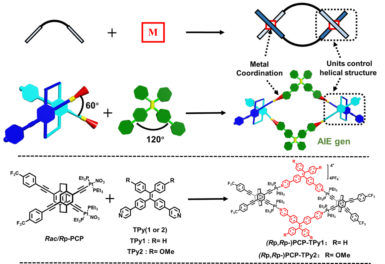 近日,51吃瓜 的江华教授课题组报道了基于二苯环蕃双螺旋结构的高效人工光捕获系统。二苯环蕃(PCP)是具有平面手性结构的基元,现已广泛应用于手性助剂、配体以及超分子组装等方面,因其取代角度不同,又可分为伪对位、伪间位、伪邻位。该课题组通过对伪邻位二苯环蕃进行修饰成功获得了具有60°开合角度的外消旋及手性二苯环蕃双铂配体。此PCP配体可与120°角度的二吡啶四苯乙烯配体通过配位作用形成具有菱形空腔的特殊双螺旋结构,区别于传统的双螺旋结构,这种新型的双螺旋结构并不是由Pt-N的金属中心主导,而是由PCP基元进行控制。通过核磁、质谱、理论计算等多种手段对这种双螺旋结构及其手性双螺旋结构进行了表征。此外,由于四苯乙烯(TPE)单元的引入,这些双螺旋结构也展现出优异的聚集诱导发光效应(AIE)。利用双螺旋结构在THF/水中的AIE性质和球形形貌,通过添加染料构筑了多种单步人工光捕获体系以及一个连续光捕获体系,其中连续能量传递体系的能量传递效率高达89.3%。由于这些双螺旋结构具有一定的固态发光,因此它们也可以制备成薄膜或应用于白光LED器件,具有巨大的应用潜力。此工作不仅为构建新型双螺旋结构和人工ALHSs提供了一种独特的策略,而且为固态双螺旋结构作为手性荧光材料的潜在应用提供了前景。