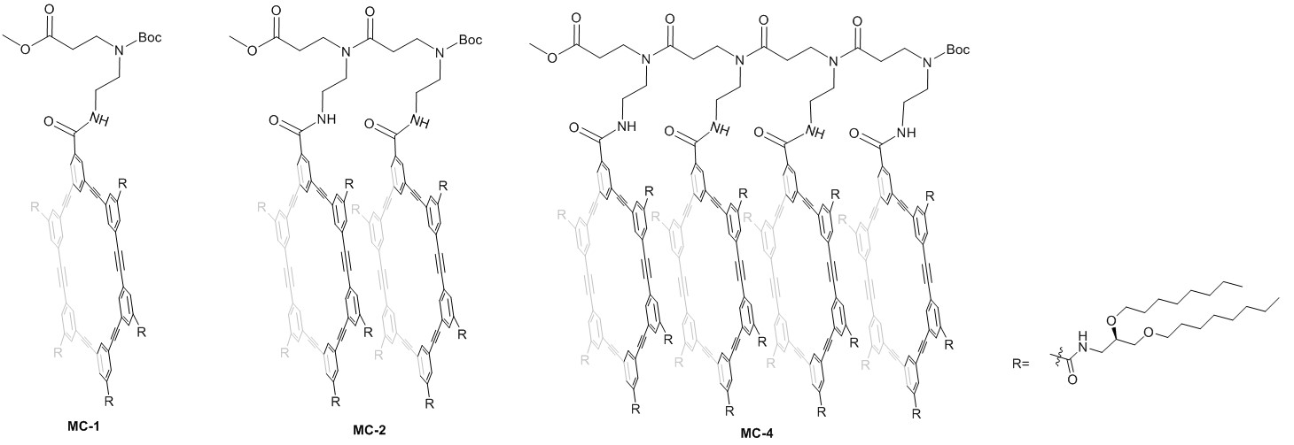 这项工作中采用了模块化合成的策略,在m-PE大环(MC-1)外侧引入β-丙氨酸残基,通过β-丙氨酸残基的偶联反应,制备出寡聚β-丙氨酸衍生物,同时实现m-PE大环的共价连接,为有效构建长度可控的有机纳米管提供了一种可靠的策略。