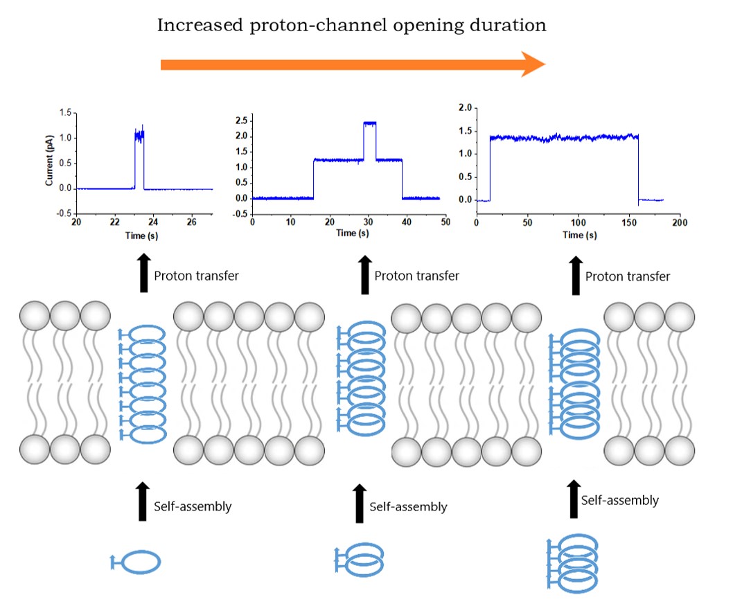 通过核磁共振氢谱、紫外-可见光光谱、圆二色谱以及荧光光谱法等实验,研究了这些大环分子形成自组装纳米管的倾向性和稳定性差异。结果表明,相比于二聚体MC-2和单体MC-1的自组装,四聚体MC-4的组装体表现出更强的稳定性。平面脂双层离子通道实验显示,四聚体MC-4形成的离子通道,对氢离子的持续通导时间能够长达约二分钟,比早期发展的m-PE大环自组装通道的持续开启时间增加了约两个数量级(图2)。研究发现,减少形成跨膜通道所需的构筑模块数量,有助于降低自组装过程中不利的熵效应,使得大环更容易通过堆积形成纳米管道。