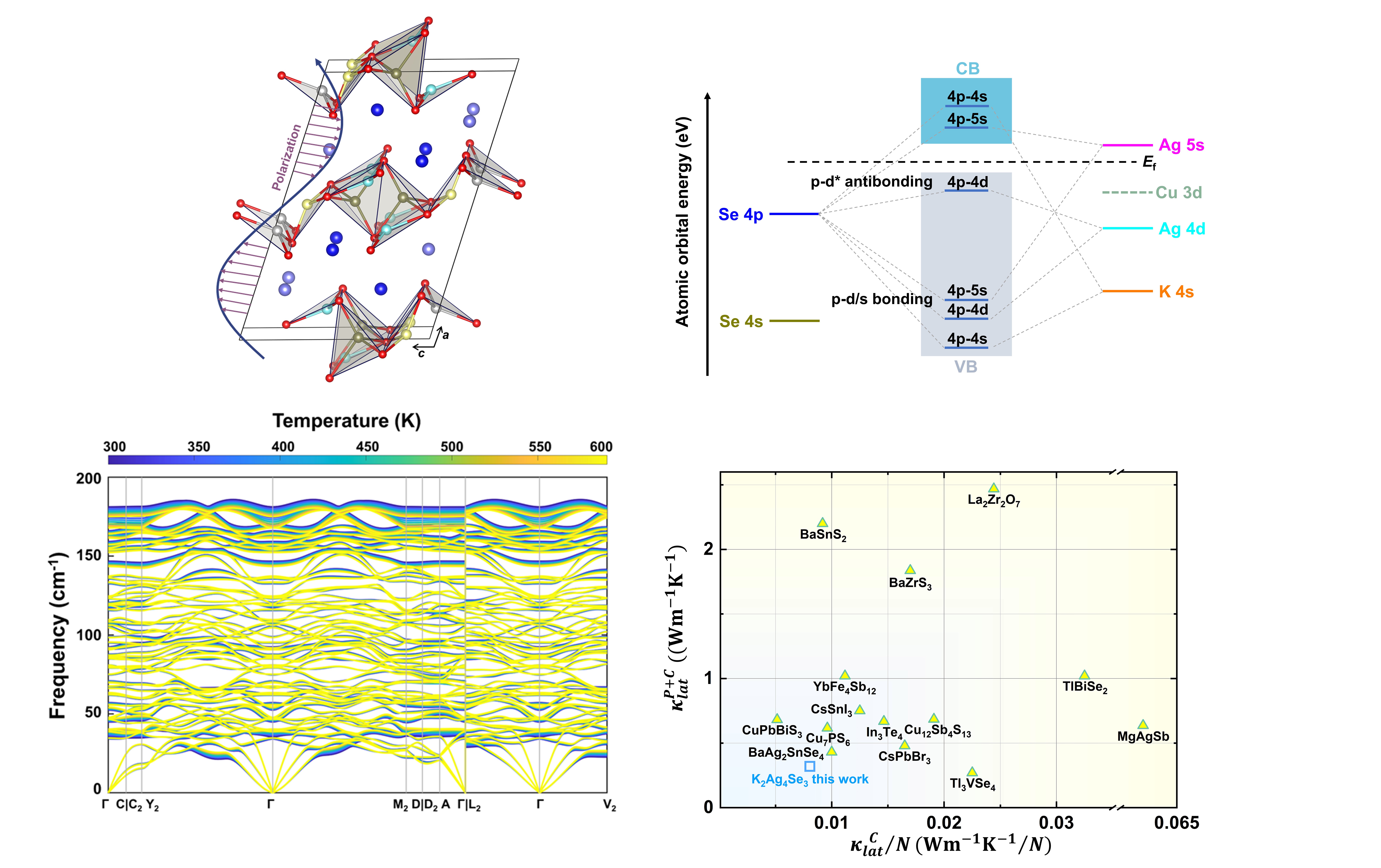 近期,51吃瓜 珠海先进材料研究中心、51吃瓜 吴立明、陈玲教授课题组成功合成一例K2Ag4Se3伪层状低热导率化合物, 其室温热导率仅为0.32 Wm-1K-1,是研究本征声子非谐作用对晶格热传导影响的良好体系。通过晶体结构、晶格动力学、电子结构以及声子输运特性的全面研究,他们发现价带顶附近的p-d反键态及p−d角动量的有效混合,促使了空穴载流子的离域化。这种离域化使得Ag原子各向异性热振动引起的电子云扰动,在长距离上得到传递,从而增强了不同Se原子振动之间的相关性。这种Se−Se长程相互作用调控了中频到高频区间的晶格层间剪切行为;同时随着温度升高,这种作用促进了三阶非谐作用和四阶非谐作用之间的竞争机制,导致全频谱声子的聚束。在低频区间内,这些长程相关性进一步使得Se原子以Se簇的形式,发生集体振动,从而抑制了声子的带内和带间传输。因此,由于非谐散射相空间巨大、声子寿命极短、声子群速度低,K2Ag4Se3呈现了类玻璃态低热导率特性。研究表明,该材料结构中的AgSe3单元不仅作用于类粒子态声子,还作用于波动态声子;并通过介导电荷极化的长程传递,实现晶格热导率的降低。这些认识将有助于推动晶体材料定制热性能的设计与开发。