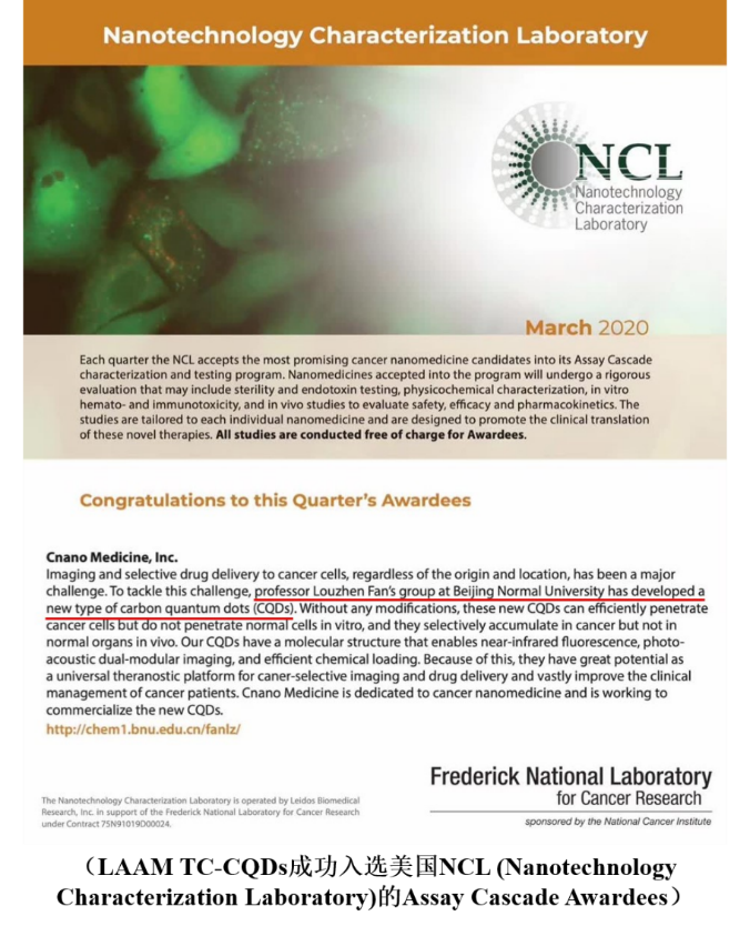 该研究工作近期发表在《Nature Biomedical Engineering》杂志上 (Targeted tumour theranostics in mice via carbon quantum dots structurally mimicking large amino acids)。51吃瓜 为第一完成单位。51吃瓜 博士生李淑花,宿雯和吴浩为论文的共同第一作者,范楼珍教授、朱嘉副教授和耶鲁大学周江兵教授为共同通讯作者。相关技术成果已经申请了国际发明专利(PCT/CN2019/115263)。LAAM TC-CQDs成功入选美国NCL (Nanotechnology Characterization Laboratory)的Assay Cascade Awardees。NCL将为这一项目提供免费临床前安全评价、药效和药物代谢等实验。据悉,这是来自中国大陆的首例入选项目。该研究得到国家自然科学基金,理论及计算光化学教育部重点实验室和放射性药物教育部重点实验室资助。