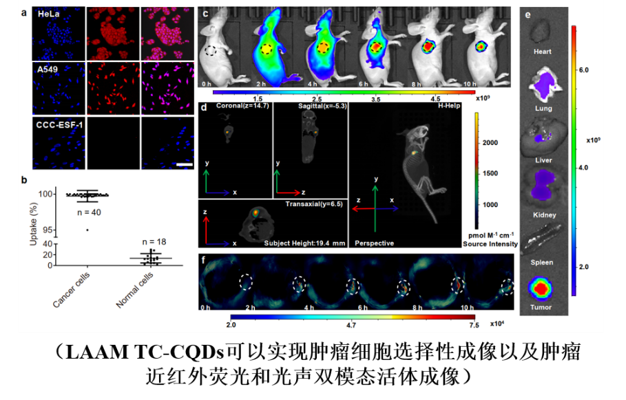 这项研究发现,LAAM TC-CQDs的边缘具有多个游离的α-氨基酸基团,通过大中性氨基酸转运体1(LAT1)介导内吞高选择性地进入肿瘤细胞。由于LAT1 在大多数肿瘤细胞中过表达而只在少数组织 (血脑屏障、胎盘、脾脏、睾丸和结肠等)表达,因此,LAAM TC-CQDs对癌细胞具有广谱的精准靶向性。LAAM TC-CQDs在700 nm处发射荧光,成功用于多种肿瘤细胞的成像以及荷瘤鼠体内荧光和光声双模态成像。通过共聚焦荧光显微镜图像可以观察到LAAM TC-CQDs被HeLa 和A549等多种癌细胞摄取,但是在同样的条件下却几乎不被正常体细胞摄取,细胞流式实验结果同样印证了这一发现。活体成像可以发现,LAAM TC-CQDs可以高效在肿瘤富集而几乎不在正常器官富集。LAAM TC-CQDs作为化疗药物拓扑替康(TPTC)的载体,仍然能够精准靶向肿瘤,成功将药物选择性地递送至肿瘤组织。作为TPTC的载体,LAAM TC-CQDs的化疗效率远远超过了游离的TPTC以及已经商业化脂质体载体。更有意义的是,由于血脑屏障是为数不多的过表达LAT1的正常组织之一, LAAM TC-CQDs可以成功穿过血脑屏障,实现了脑肿瘤成像并成功将抗癌药物靶向递送至脑肿瘤。
