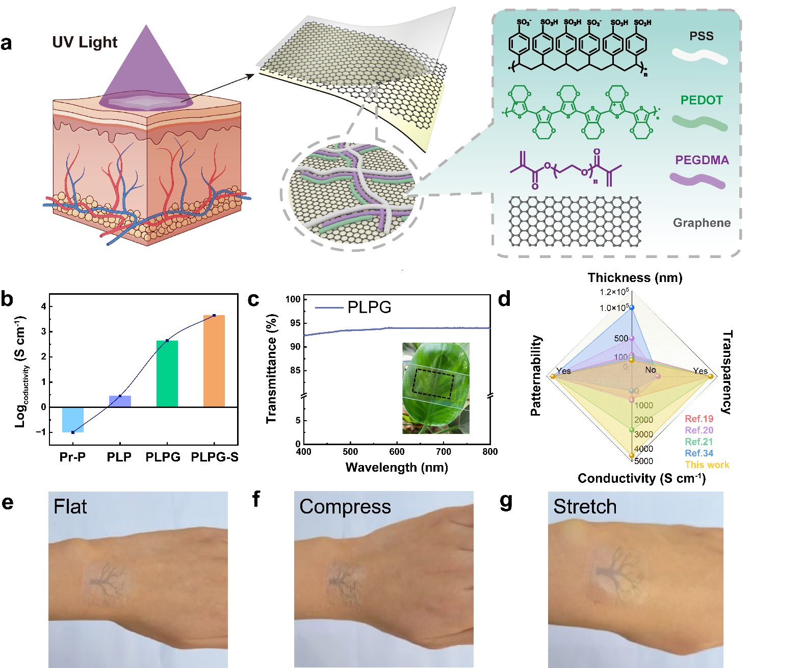 近日,51吃瓜 刘楠课题组报道了一种40 nm厚的聚合物薄膜作为可图案化的超贴肤生物电极。该薄膜由聚(3,4-乙烯二氧噻吩):聚苯乙烯磺酸盐(PEDOT:PSS),化学气相沉积法生长的石墨烯膜以及紫外光敏感的聚合物交联制成(命名为PLPG)。其具有优异的导电性和透光性(4458 S/cm @ > 90%),拉伸性(105%)以及与光刻技术的兼容性。可图形化,高导电性和拉伸性的实现源自PLPG中的π-π相互作用和静电相互作用等。PLPG的超薄特性使其能与皮肤形成无缝贴合,实现准确的电生理信号记录(图1)。