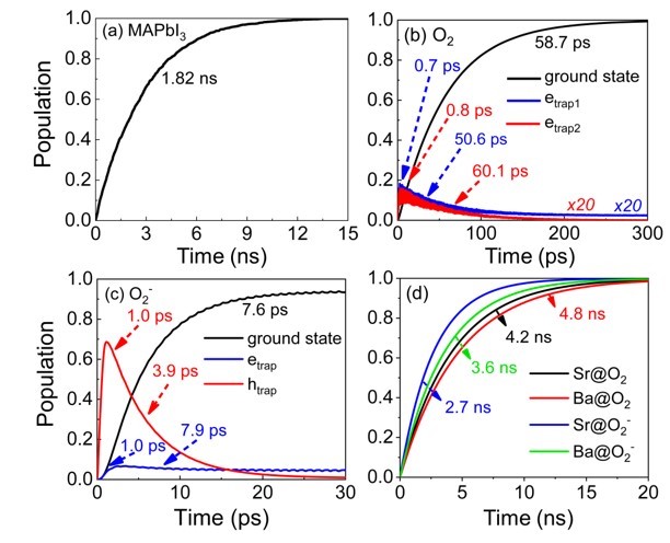 循着这一思路,51吃瓜 龙闰教授和方维海院士课题组,采用组合含时密度泛函理论和非绝热分子动力学,研究了碱土金属对钙钛矿中O2和O2-的钝化效果及其对钙钛矿载流子动力学的影响。 O2在MAPbI3禁带中产生两个深能级电子俘获态,O2-使其中一个电子俘获态转变为空穴俘获态,形成一堆电子-空穴俘获态,我们称之为“超级俘获态”。当碱土金属原子(Mg、Ca、Sr、Ba)钝化O2和O2-后,确实打断了O-O键,将原始O-O键的高能量反键轨道转化为低能量的单原子O-2p轨道,将氧元素引入的缺陷态移动到价带内。