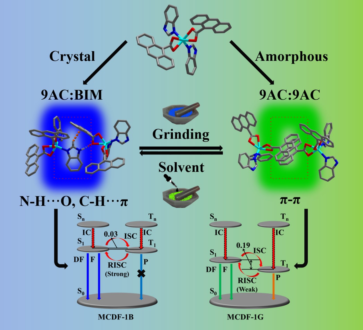近年来,智能响应发光材料引起了研究人员广泛关注,其在信息安全,数据记录以及存储设备等领域具有重要的应用价值。力致变色发光材料是在外力作用下(例如剪切、研磨、刮擦等),其发光波长位置、发光强度、发光寿命等光物理性质发生改变。该过程可通过在外力作用条件下,分子间弱作用力(氢键、C-H…π、π-π)发生改变导致,该变化通常可以利用溶剂熏蒸或热处理进行恢复。因此,合理平衡分子间不同作用力成为了设计力致变色发光材料的关键。目前为止,绝大多数智能发光体系都是基于传统的荧光或磷光机理构筑的,对于涉及单重态与三重态能量转换的力致变色延迟荧光(Mechanochromic Delayed Fluorescence, MCDF)材料报道较少。