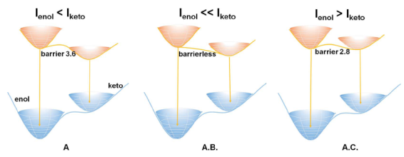 UV-P是一种常见的紫外吸收剂和荧光材料,其羟基(质子给体)中的O原子与三唑单元(质子受体)的N原子之间可以发生ESIPT。八氟萘烷和1,4-二碘四氟苯(B和C,图1)可与UV-P通过氢键、卤键或π-π相互作用形成共晶。光致发光发射光谱显示,与初始的UV-P固体相比,两种共晶的ESIPT发光发生了明显的增强或减弱,实现了基于分子间相互作用和分子聚集状态的变化来调控其固态ESIPT发光。高精度理论计算(DFT,TD-DFT和MS-CASPT2)进一步从电子结构角度证实了分子间相互作用和分子取向可进一步改变ESIPT过程的激发态势垒以及烯醇-酮互变异构体的相对比例(图2)。