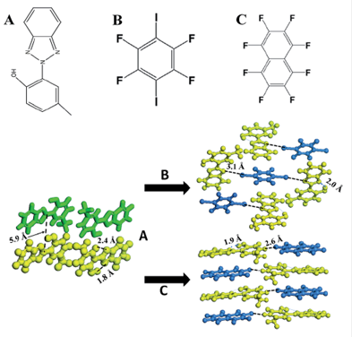 图1. UV-P(A)及其与1,4-二碘四氟苯(B)和八氟萘烷(C)形成共晶的固态堆积模式