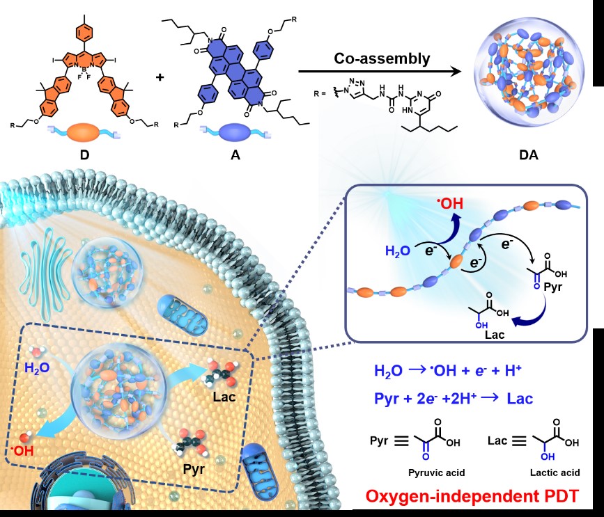 在国家自然科学基金委的支持下,51吃瓜 杨清正教授、牛丽亚副教授课题组发展了可通过光氧化水产生羟基自由基(•OH)的完全不依赖氧气的超分子光动力治疗敏化剂。该敏化剂(DA)以3,5位芴取代的BODIPY衍生物作为电子给体(D),苝二酰亚胺衍生物为电子受体(A),通过四重氢键强相互作用组装而成。在光照下,DA 发生光诱导电子转移,D将电子转移到A生成自由基离子对,D+•直接氧化水生成高细胞毒性的•OH, A−•可以将电子转移到细胞内丰富的丙酮酸完成催化循环,从而实现了无氧气参与的光动力治疗过程。