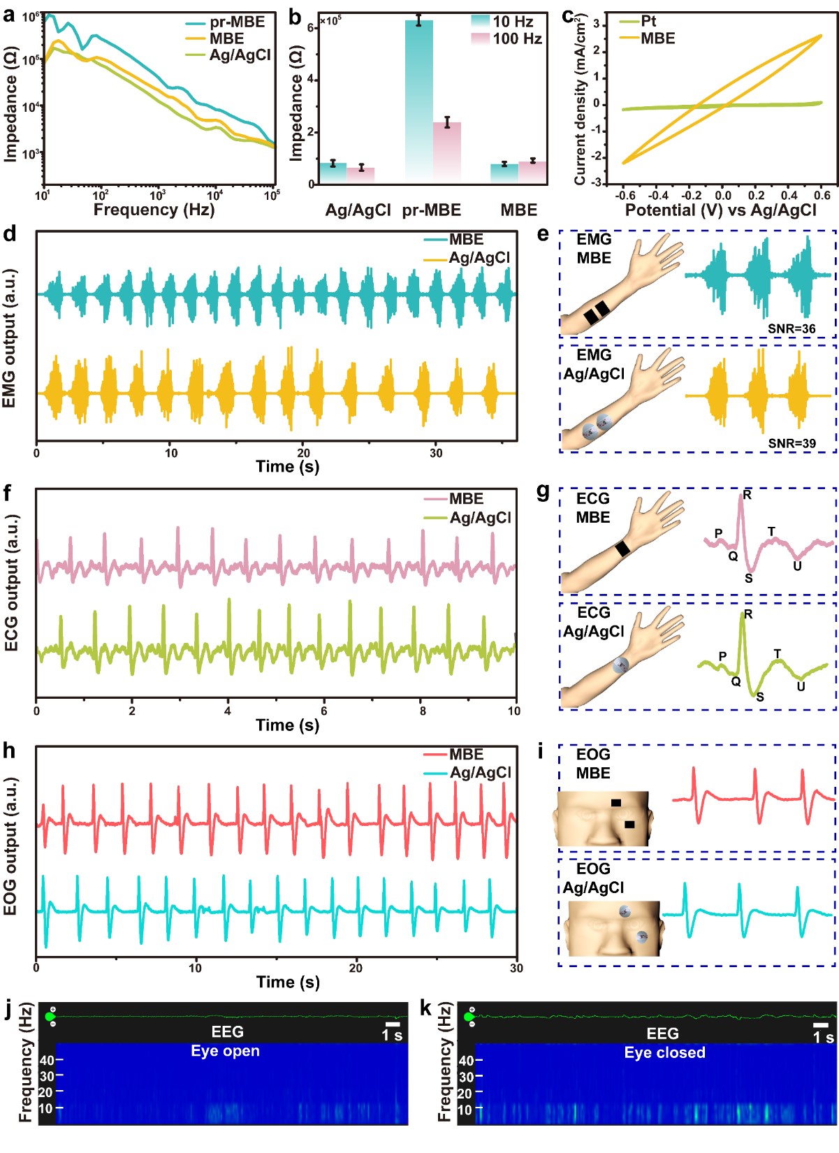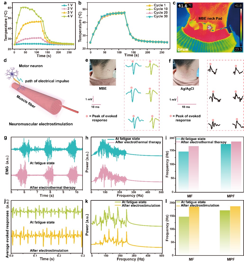 近日,51吃瓜 刘楠教授团队开发出一种一体化、生物衍生、透气且汗液稳定的MXene表皮电极用于肌肉诊疗。该工作是以紫叶狼尾草为原料,通过化学刻蚀制备得到柔性多孔纤维素骨架。 然后负载MXene导电层,并在人工汗液中浸泡交联,得到多孔、高导电的MXene电极(图1)。由于草本植物的结构排列和MXene在汗液中的离子交联,该电极具有高透气性和各种环境低且稳定的电极-皮肤界面阻抗。因此,该电极可以可靠地采集表皮电生理信号,如肌电图(EMG)、心电图(ECG)、眼电图(EOG)和脑电图(EEG)(图2)。此外,由于其良好的焦耳加热能力,电极表现出低电压热疗效果。将电刺激、电热治疗和电生理传感器集成为一个系统,可实现一体化诊断和治疗,为肌肉疲劳的日常穿戴式诊疗提供了一种实用的方式(图3)。它还可以通过人机交互进行肌肉康复训练和假肢控制。