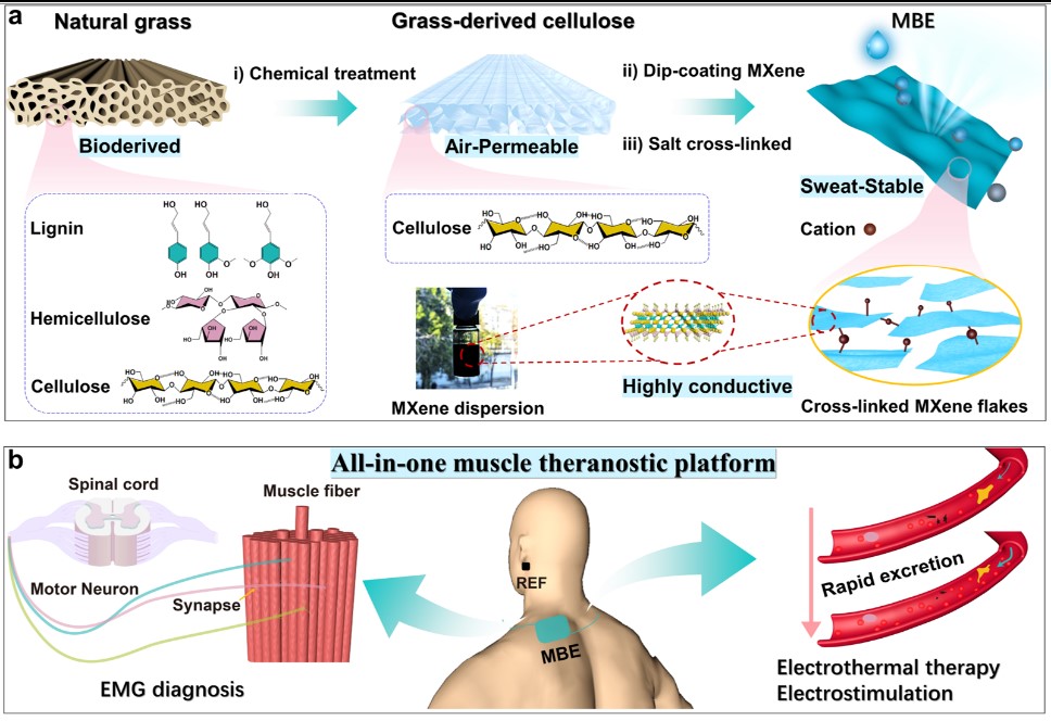 相关工作以“An All-in-One, Bioderived, Air-Permeable, and Sweat-Stable MXene Epidermal Electrode for Muscle Theranostics”为题发表在ACS Nano上。文章第一作者是在读博士研究生宋德魁。该研究得到了北京市农林科学院侯新村研究员植物筛选方面的支持。该研究获得了国家自然科学基金委的资助。