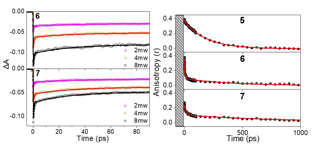 图3. 泵浦能量依赖瞬态吸收和瞬态吸收各向异性动力学曲线图。