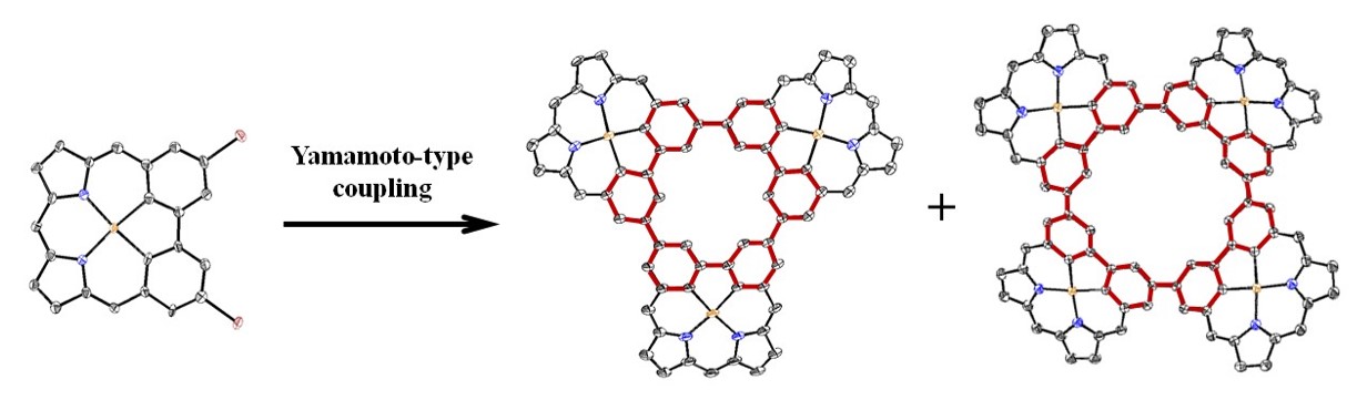 最近,51吃瓜 柯贤胜课题组首次报道了两个基于碳杂卟啉的共价环状阵列(图2)。碳杂卟啉是卟啉的一个或多个吡咯氮原子被碳原子取代后的衍生物,可以根据非吡咯单元的不同,呈现出芳香性,反芳香或者非芳香性。本文以非芳香的联苯碳杂卟啉为单体,巧妙地引入二溴取代,然后通过一锅法Yamamoto偶联,经过GPC分离和重结晶,可以14%和4%的收率分别得到共价环状三聚体和四聚体。这两个新颖的环状卟啉阵列,均含有一个环间苯撑(CMP)的内核,因此构筑了卟啉化学和环状联苯化学之间的新桥梁,有可能作为一类新的大环主体化合物。