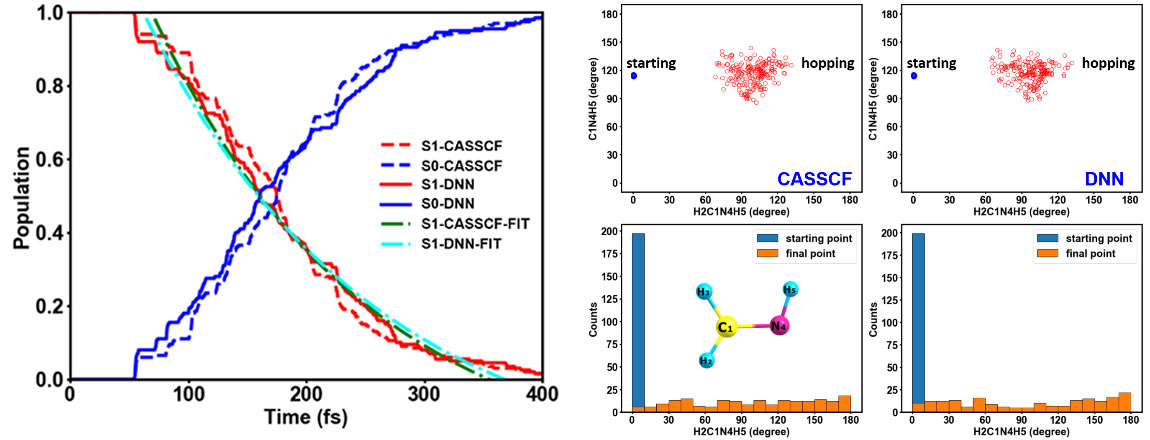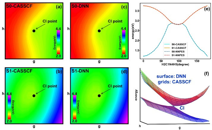 最近,51吃瓜 崔刚龙老师利用基于神经网络的深度学习方法首次精确重现了多原子分子体系基态和激发态的势能面及其交叉区域的拓扑结构,并利用所得到的多态势能面进行了非绝热动力学模拟。基于深度学习的非绝热动力学模拟在降低计算量的同时,给出了和从头算级别非绝热动力学模拟近乎一样的动力学结果。结果表明深度学习方法可以足够准确地重复复杂的多态势能面的拓扑结构,可用于研究复杂的光物理和光化学反应动力学的研究。