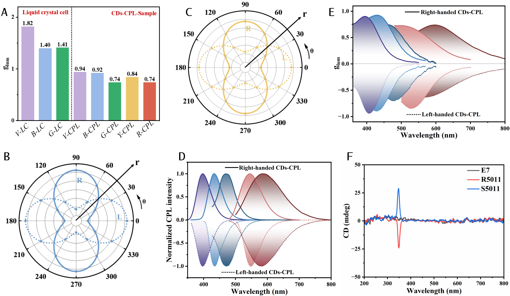 图2全色碳量子点圆偏振发光材料的CPL特性