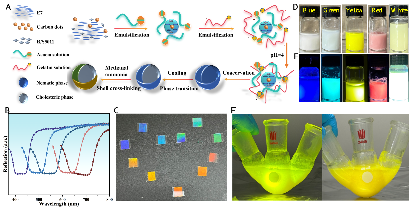 针对上述关键科学问题,袁方龙教授课题组利用一种限域螺旋共组装策略(图1),将具有优异光学性能的环境友好型碳量子点与手性液晶基质协同螺旋自组装。通过精确调控手性诱导剂的掺杂质量分数,实现了光子带隙在全可见光范围内的调控。进一步结合碳量子点的发光波长调控,成功构建出一系列同时具有高glum及高PLQY的全色CPL发光材料体系(图2)。此外,该体系还被初步应用于柔性圆偏振发光图案打印及多级防伪特征构建,展现出良好的应用前景。该工作不仅在新型手性光子材料的结构设计方面取得一定突破,也为智能防伪标签、裸眼3D显示与光量子信息存储等关键应用领域提供了潜在的材料基础与技术路径。