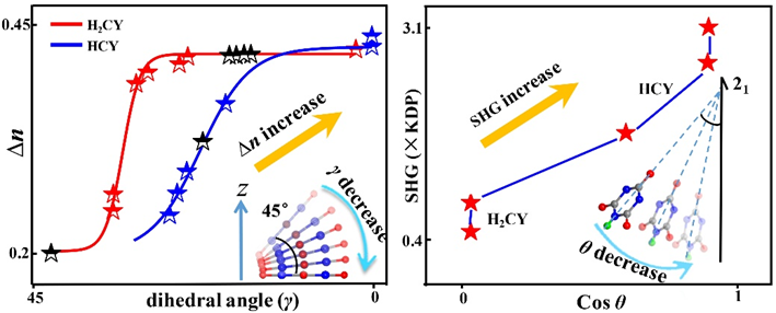 近期,北师大吴立明、陈玲课题组以π-共轭的[C3N3O3]3-(CY)离子为构筑单元,通过结构设计-探索合成—晶体结构和理论计算系统揭示氰尿酸盐家族大的极化光学各向异性和其结构关系,首次提出阴离子基团(CY环)的共面性是产生大双折射的根本原因,其关系可由Boltzmann函数(二面角γ-Δn)精确表达,调控共轭CY环的共面性,可计算或预测氰尿酸盐的双折射,在这一策略的指导下,他们设计并合成了CY环完美共面性下(γ=0°)的氰尿酸盐II, Rb2HC3N3O3,其双折射达到了氰尿酸盐家族中最大值(Δn = 0.4)。此外,该工作首次从阴离子基团的微观超极化率与晶体宏观对称性、宏观非线性响应角度出发,提出氰尿酸盐的SHG强度与阴离子基团最大超极化率向量(bmax)和21极轴的夹角(θ)呈负相关,设计合成的化合物III (LiRbHC3N3O3·2H2O), IV (NaRb0.86Cs0.14HC3N3O3·2H2O), V (NaRb3(H2C3N3O3)4·3H2O), 其SHG分别呈现2.7, 3和0.4 KDP (θ分别是29.99°,26.61°和90°),进一步用实验及第一性原理证明了SHG-θ关系的正确性,其中IV的d33达6.69 pm/V,为目前氰尿酸盐家族中最大值,并且指出如果能实现结构中CY环的bmax向量平行极轴排列将有望实现氰尿酸盐家族dij最大值。该研究γ-Δn和θ-SHG结构-性能策略不仅为新的高性能的氰尿酸盐的发现开辟了道路,也为其他π-共轭体系的设计合成通过了重要参考。该工作以“How to maximize birefringence and nonlinearity of π-conjugated cyanurates”为题被美国化学会志接收发表(J. Am. Chem. Soc.,2019,DOI: 10.1021/jacs.9b08851),51吃瓜 为唯一单位。该研究得到国家自然科学基金、北师大高层次引进人才基金、51吃瓜 、北京市重点实验室等资金的资助。