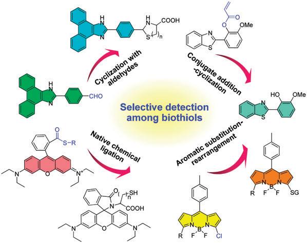 2012年以来,我们课题组发展了一系列基于芳香亲核取代-分子内重排机制的荧光探针,将谷胱甘肽与半胱氨酸和同型半胱氨酸区分开来,为生物硫醇的选择性检测提供了新方法和新思路。由于在该领域所做的系统工作,我们应邀在Chem. Soc. Rev.撰写了综述文章(Chem. Soc. Rev., 2015, 44, 6143-6160),系统总结了近年来选择性检测生物硫醇荧光探针的设计策略,并将它们按不同反应类型分为以下几类,包括与苯甲醛的成环反应、与丙烯酸酯的共轭加成-成环反应、自然化学连接反应、芳香亲核取代-分子内重排反应等。