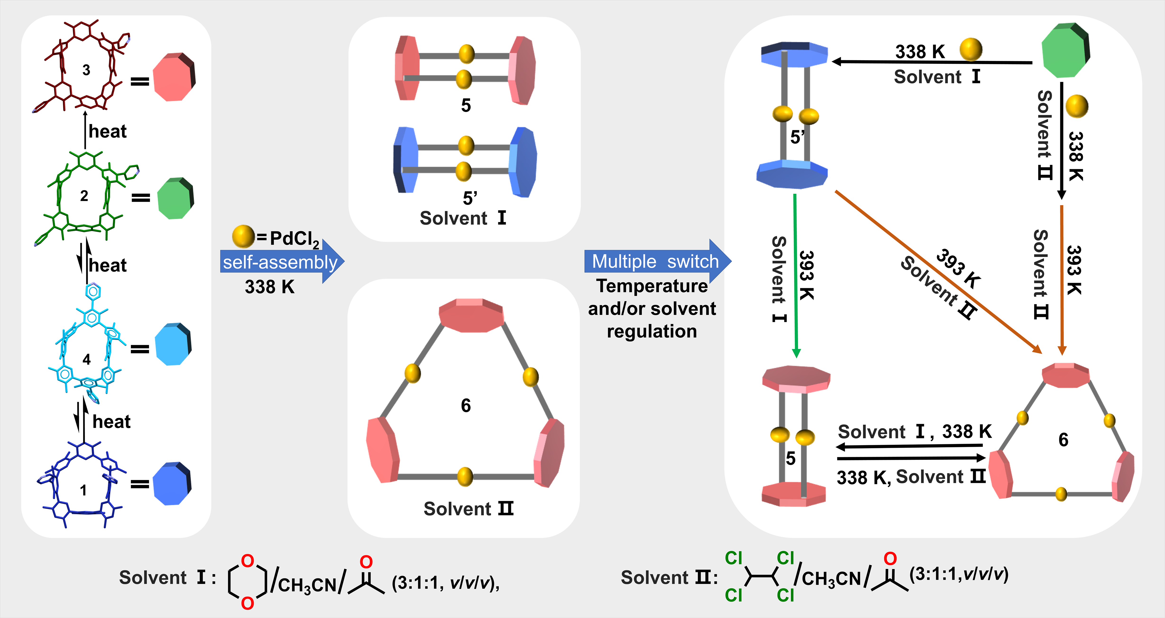 总之,本研究构建了一种创新的多功能化学开关系统,能够实现对金属-有机笼(MOC)构象组装行为的精确调控。该系统基于新型大环配体(CP2)的阻转异构体结构设计,展现出对温度与溶剂等外部刺激的协同响应能力,进而实现了不同类型MOC的可控组装及其可逆转化。通过引入多刺激耦合调控机制,本工作不仅拓展了对金属-有机笼动态结构调节策略的理解,也为开发可编程、自适应的智能分子材料提供了重要理论依据与实践路径,回应了智能材料构筑中对结构可控性与响应可逆性的关键需求。