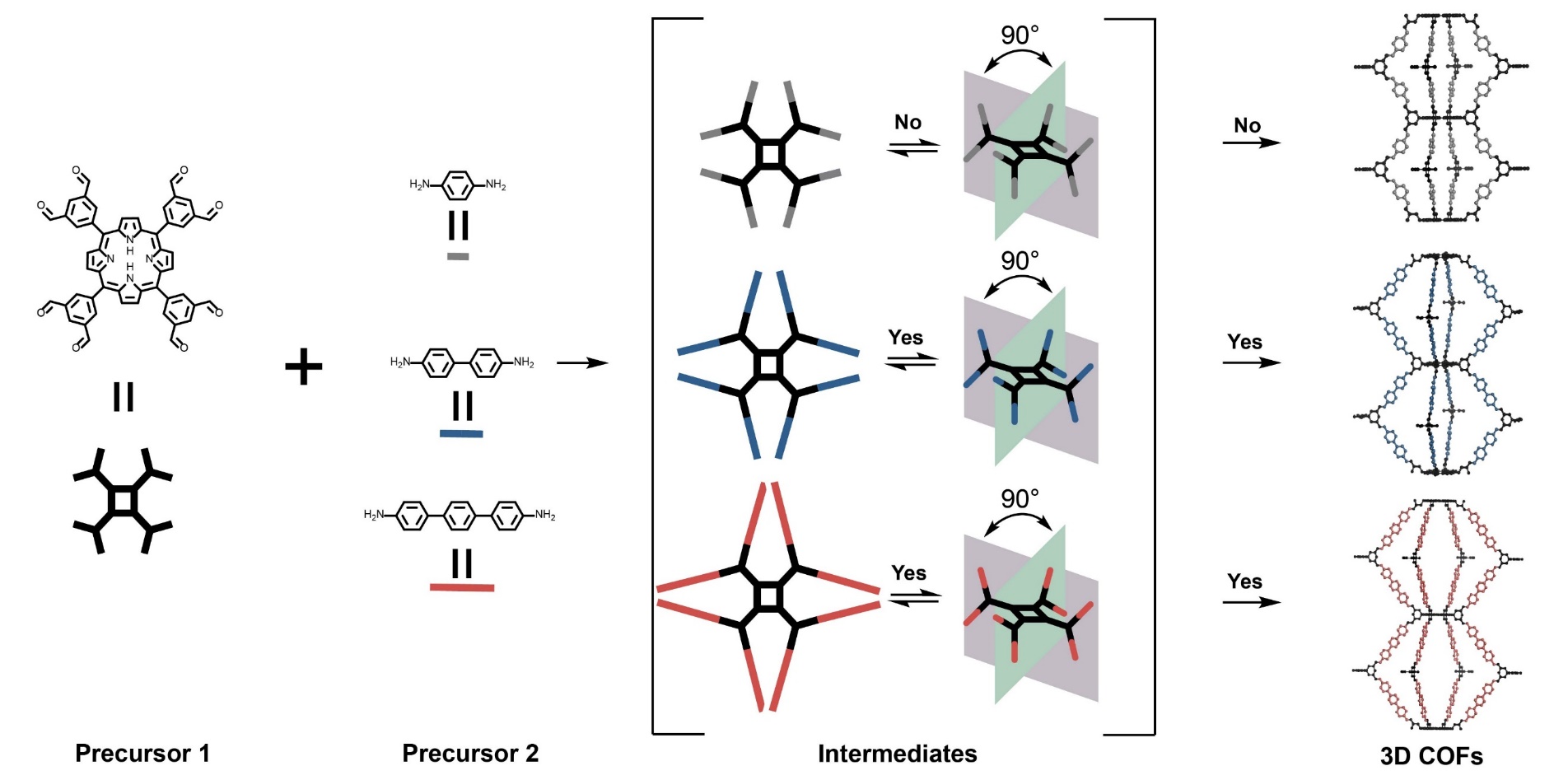 中间体位阻效应诱导三维COFs形成的机制示意图
