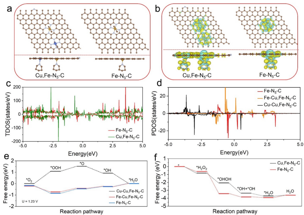氧还原反应(ORR)是燃料电池、金属-空气电池等清洁能源技术的核心反应过程,但其缓慢的动力学特性严重制约了能量转换效率。近年来,铁-氮-碳(Fe-N-C)材料因具有高原子利用率、低成本及可调的电子结构,成为最具潜力的非贵金属ORR催化剂候选者。然而,Fe-N-C在实际应用中面临严峻挑战:Fe活性位点在碱性环境中易发生溶解和氧化,且ORR过程中产生的过氧化氢(H₂O₂)会通过电化学芬顿反应(Fe²⁺ + H₂O₂ → Fe³⁺ + ·OH + OH⁻)生成高活性羟基自由基(·OH),加速Fe位点脱落和催化剂失活,严重损害材料耐久性。因此,4e-ORR过程中H₂O₂的持续积累是导致Fe-N-C性能衰退的关键瓶颈。