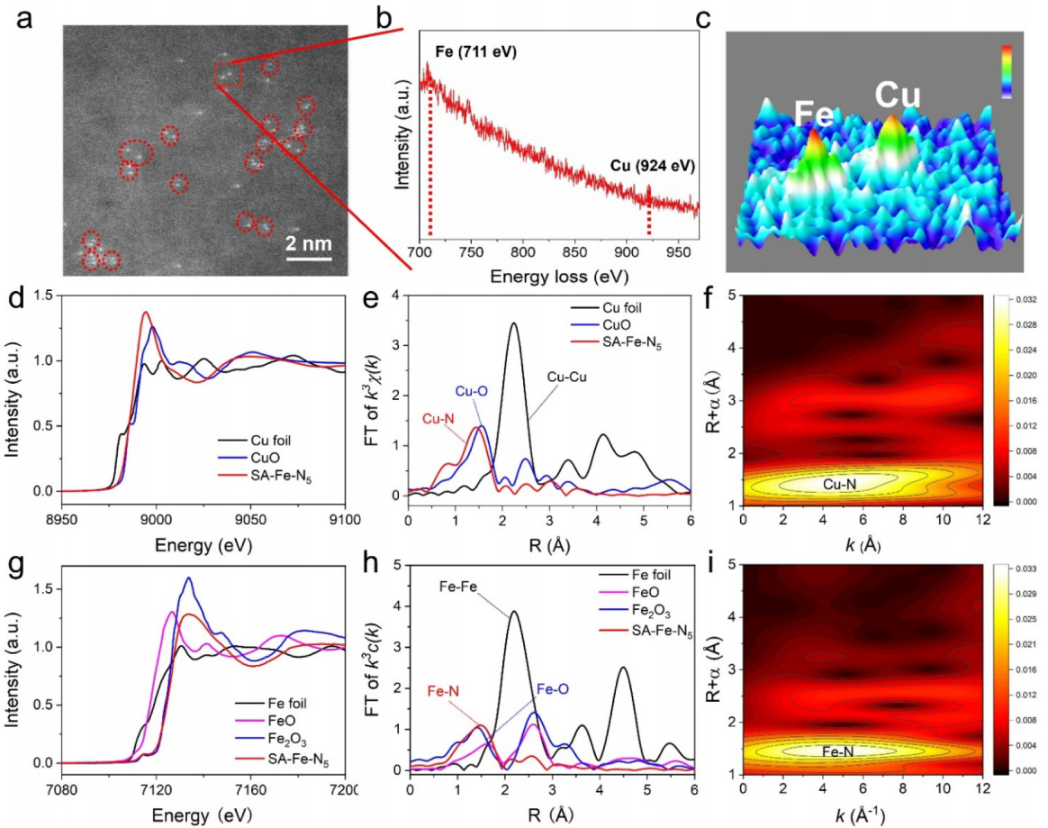 基于此,51吃瓜 孙根班教授团队开发了一种CuN5单原子纳米酶(SAzyme)辅助的Fe-N5催化剂,通过铜-铁双原子位点协同作用显著提升ORR性能。研究结果表明,SA-Fe-N5在碱性电解质中展现出优异的ORR活性,其半波电位(E1/2)和扩散极限电流密度(Jk)与商业Pt/C相当。如图1所示,通过DFT计算揭示了Cu-N5单原子纳米酶对Fe单原子催化剂体系的协同优化机制:(1)Cu作为电子供体通过碳骨架提升Fe位点电子密度,优化ORR中间体吸附能垒,从而提高ORR催化活性;(2)Cu-N5位点作为类过氧化氢酶优先分解H₂O₂,有效抑制Fe引发的芬顿反应,进一步提高ORR催化稳定性。如图2所示,通过配体-介导法成功合成Fe/Cu双原子催化剂,通过EXAFS拟合确认Cu-N5和Fe-N5的配位构型,最终确定Fe-N5/Cu-N5双原子位点。如图3所示,优化后的SA-Fe-N5在碱性电解质中中达到0.89 V(vs. RHE)的半波电位,其性能超越传统商用Pt/C和Fe-N5。关键创新在于引入Cu位点有效抑制Fe位点的类芬顿效应,使羟基自由基(·OH)生成量降低。电化学稳定性结果表明,SA-Fe-N5催化剂经10000次循环后半波电位衰减仅7.2 mV,显著优于Fe-N₅(34 mV)。作为锌-空气电池阴极催化剂,SA-Fe-N5实现了217.8 mW cm-²的峰值功率密度和808.7 mAh g-1的比容量,在10 mA cm⁻²下稳定循环110小时,展现其商业化应用潜力。本研究将理论研究与实验验证相结合,为进一步设计高耐久、低成本ORR电催化剂提供了创新策略和新的视角。