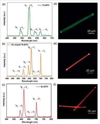 在稀土功能材料领域,镧系金属-有机框架(Ln-MOFs)是一类重要的有序晶态化合物,具有丰富的电子结构和优良的光物理性质。近年来,Ln-MOFs发光材料在生物成像、光学防伪、传感器、光纤通讯、激光系统等领域具有重要的应用价值,引起了研究者们的极大关注。如何在微纳尺度进一步调控该类材料的光电子学特性是其在功能微纳器件领域应用的新需求。