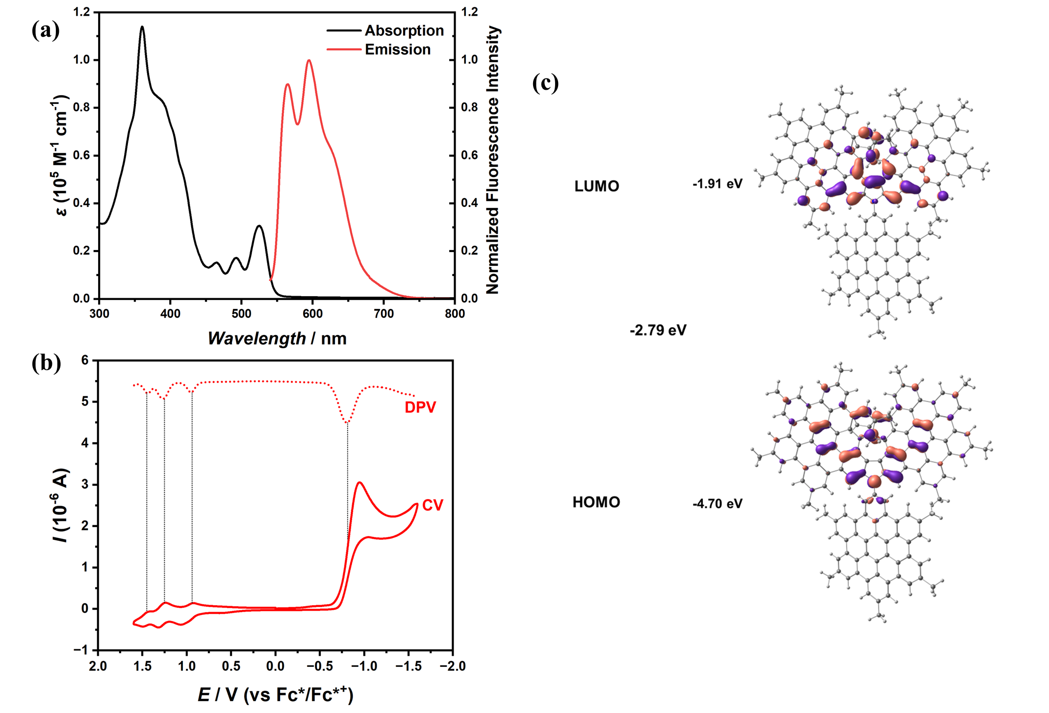 通过引入HBC(六苯并蔲)基团,分子1的紫外吸收和荧光发射光谱均表现出显著的红移,并易于形成激基复合物而导致荧光最大发射峰位于红光区628 nm处。这一特性展示了分子在光电领域的应用潜力。这一机制通过实验和DFT计算得到了进一步验证。