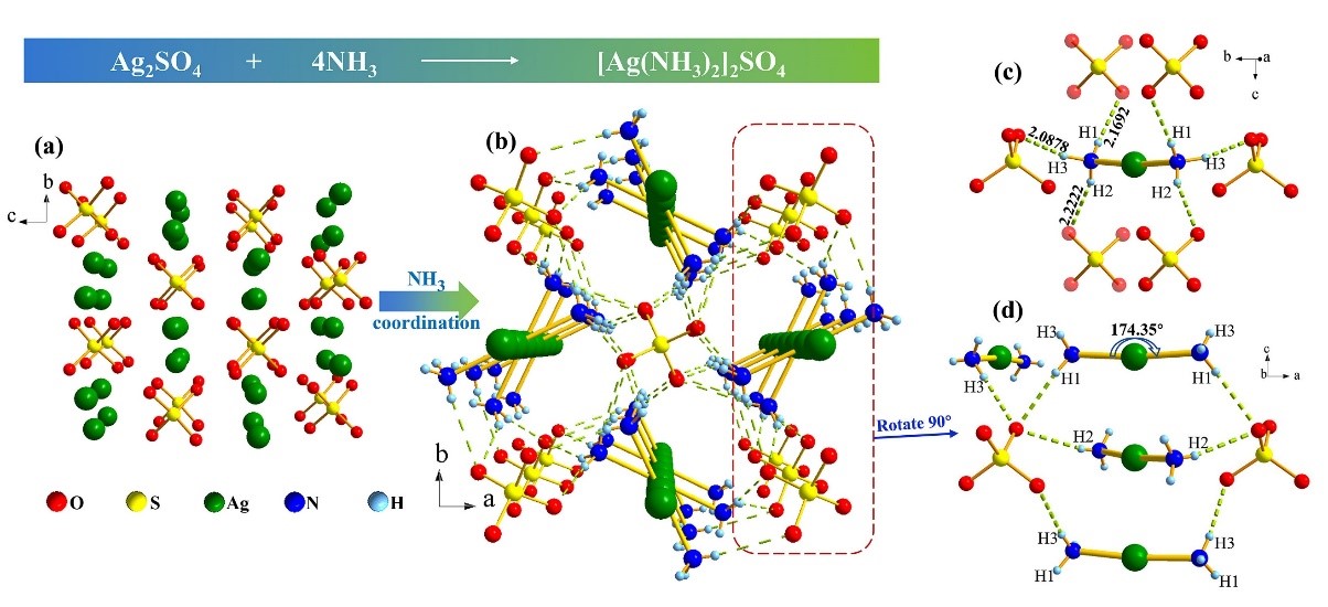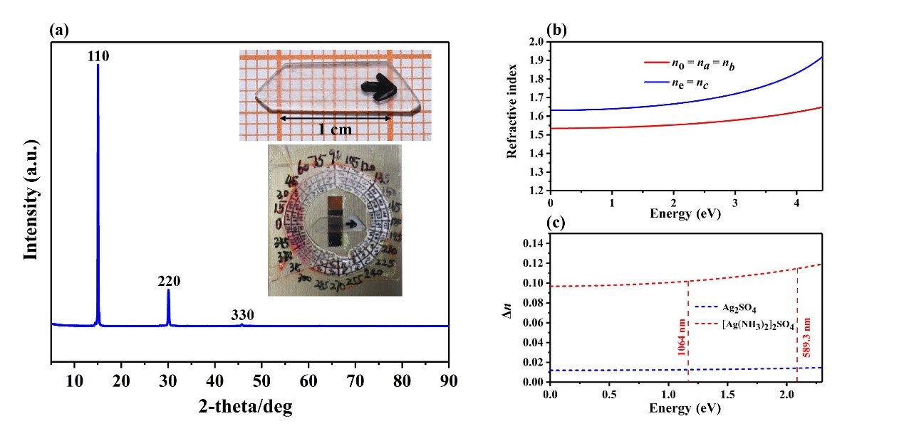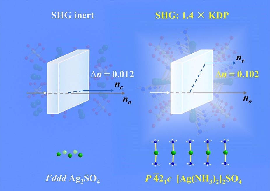 近期,51吃瓜 吴立明、陈玲教授课题组提出了一种阳离子的配位策略,实现了材料的非线性和线性光学性能提升。在该工作中,他们通过引入中性配体NH3对 Ag+ 进行配位,驱动了Ag2SO4结构从中心对称Fddd空间群向非中心对称四方P421c结构的转变,使得该体系从非线性光学惰性到非线性光学活性的转变。同时与Ag2SO4相比较(∆ncal = 0.012 @ 1064 nm),[Ag(NH3)2]2SO4晶体呈现出显著的双折射率提升(∆nexp = 0.08 @589.3 nm,计算值∆ncal. = 0.102 @ 1064 nm)。理论研究证明,[Ag(NH3)2]2SO4晶体的大双折射率特性主要来源于配位后的特殊的阳离子次结构。由于[Ag(NH3)2]+的两个配体NH3沿c轴方向形成一个N-Ag-N夹角,这使得阳离子次结构沿c轴产生了一个0.12 D的偶极,而化合物在ab平面上的偶极为零。由于该偶极可与入射光振荡电磁波产生相互作用,使得电磁波的运动在c轴方向被迟滞,从而导致该材料具有大双折射率的光学各向异性。另外,[Ag(NH3)2]2SO4表现出较大的相位匹配的SHG强度(1.4 × KDP @1064 nm),DFT理论计算表明,[Ag(NH3)2]2SO4的SHG响应由阳离子[Ag(NH3)2]+和阴离子SO42-共同贡献。上述研究结果表明在该材料中阳离子对NLO相关性能具有主要的贡献,因此该报道提出的阳离子的配位结构修饰策略,将为非线性光学材料的设计和性能提升提供新的思路。