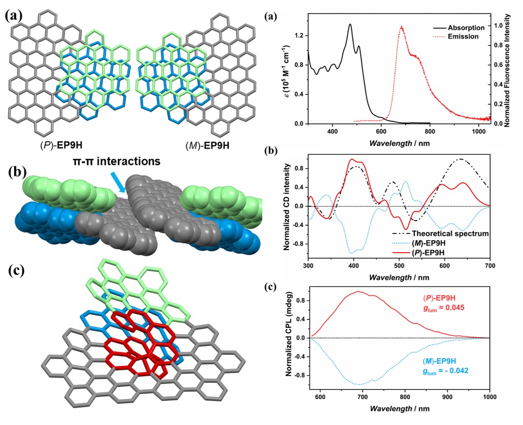综上所述,我们报道了一种具有十五苯并[9]螺旋烯核心片段的手性纳米石墨烯EP9H。与[9]螺旋烯相比,EP9H具有垂直于螺旋轴的π-体系的扩展。结构变化导致近红外区发射波长发生明显红移。此外,结构扩展显著提高了荧光量子产率和CPL性能。这些结果表明,沿螺旋轴和垂直螺旋轴的π体系扩展是获得增强CPL分子发射器的一种策略。