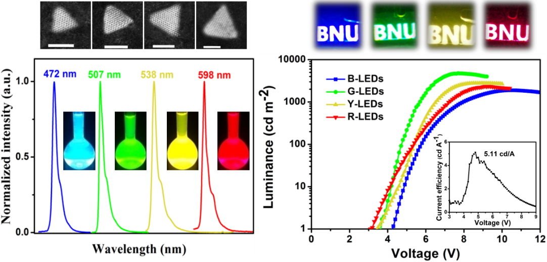 最近,范楼珍教授课题组设计合成了一种新型的不同尺寸大小的高结晶度三角形结构CQDs(NBE-T-CQDs),实现了其从蓝色到红色的高色纯度窄带宽荧光发射,其FWHM仅为30 nm,最高量子产率达72%。飞秒瞬态吸收光谱和低温变温荧光光谱及理论计算结果表明,独特的高结晶度三角形结构CQDs表现出较弱的电子-声子耦合作用以及非常简单的激发态弛豫过程,这是其产生高色纯度窄带宽荧光发射的根本原因。通过与华北电力大学谭占鳌教授以及香港科技大学杨世和教授课题组合作,以NBE-T-CQDs作为活性发光层,制备了高色纯度、高性能、高稳定性、全色电致LEDs。这项研究工作表明高色纯度窄带宽荧光发射CQDs可以作为理想候选材料用于发展下一代高效稳定广色域的LEDs显示技术。