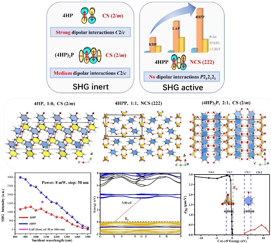 针对上述科学问题和技术需求,51吃瓜 吴立明、陈玲教授课题组近期通过第一性原理计算筛选出具有大的极化各向异性、高的超极化率和较大的带隙的极性有机发色团四羟基吡啶阳离子 (C5H6ON)+,首次提出其可作为优越的紫外日盲区NLO活性功能基元。基于此,他们利用“盐策略”,结合氢键工程,通过调节阴阳离子二元体系的摩尔比例(C5H6ON)+:(H2PO4)−= 1:0,2: 1,1: 1),有效地调控了晶体中有机基团偶极-偶极相互作用,打破了偶极相互作用诱导的“中心对称陷阱”,成功设计合成了一种性能优越的半有机紫外日盲区NLO晶体(C5H6ON)+(H2PO4)-,4HPP。研究表明,其在重要的可见至近红外光学基波范围(600-1500 nm)呈现出较大二阶倍频响应(2.1-3 × KDP), 优于唯一商业化的半有机LAP和DLAP晶体(2.14 × KDP),且其中具有π共轭的有机阳离子基团(C5H6ON)+由于其显著的结构各向异性特征,使得4HPP晶体呈现出较大的双折射率(0.25 @1064 nm),远大于具有非π共轭特点的LAP晶体( 0.075 @1064 nm)。另外,相较于LAP晶体,4HPP呈现出较宽的透过范围(0.26–1.50 μm),较好的热稳定性(166°C vs 112°C of LAP)和高的激光损伤阈值LIDT (2.2 × KDP),是迄今为数不多的、综合性能优越的、具有重要应用前景的NLO材料之一。申请发明专利一项。