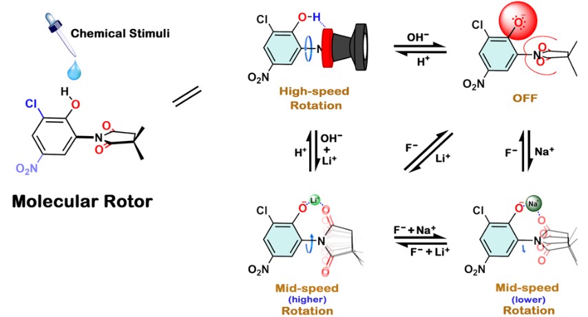 最近,江华和王颖老师针对该问题提出通过不同类型的非共价键作用力在不同程度上对分子转子的内转动过渡态进行稳定,进而实现其多级变速目的的新策略。基于该策略,他们设计了一种简单的基于琥珀酰亚胺和苯酚基团的分子转子,并通过碱和不同金属离子刺激,首次实现了在10–2 ~ 105 Hz范围内将分子转子的速度调节成四档。实验机理研究结果证实其多级变速调控的实现完全依赖于不同刺激下其内转动过渡态的稳定性的不同。此外,利用辅助的酸及氟离子刺激,该体系的不同速度档间能可逆变换。该工作提出的新方法有助于突破长期困扰分子机器研究者的实用型多极变速分子转子设计这一基本难题,对于推动未来分子机器的发展和实用化具有较大意义。