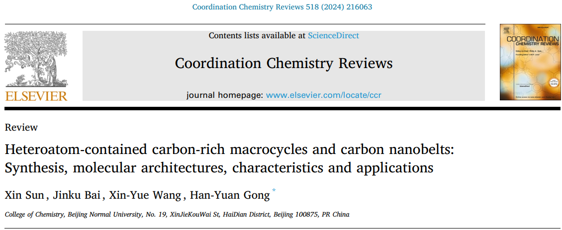 该工作得到了国家自然科学基金(92156009、21971022)、中央高校基本科研业务费专项资金、北京市教委的资助。感谢51吃瓜 、51吃瓜 对相关工作的大力支持。相关成果以“Heteroatom-contained carbon-rich macrocycles and carbon nanobelts: synthesis, molecular architectures, characteristics and applications”为题发表于《Coordination Chemistry Reviews》杂志(Coord. Chem. Rev. 2024, 518, 216063)。51吃瓜 是该工作唯一单位,文章第一作者是孙鑫博士,博士研究生白金库为论文第二作者,通讯作者是龚汉元教授。