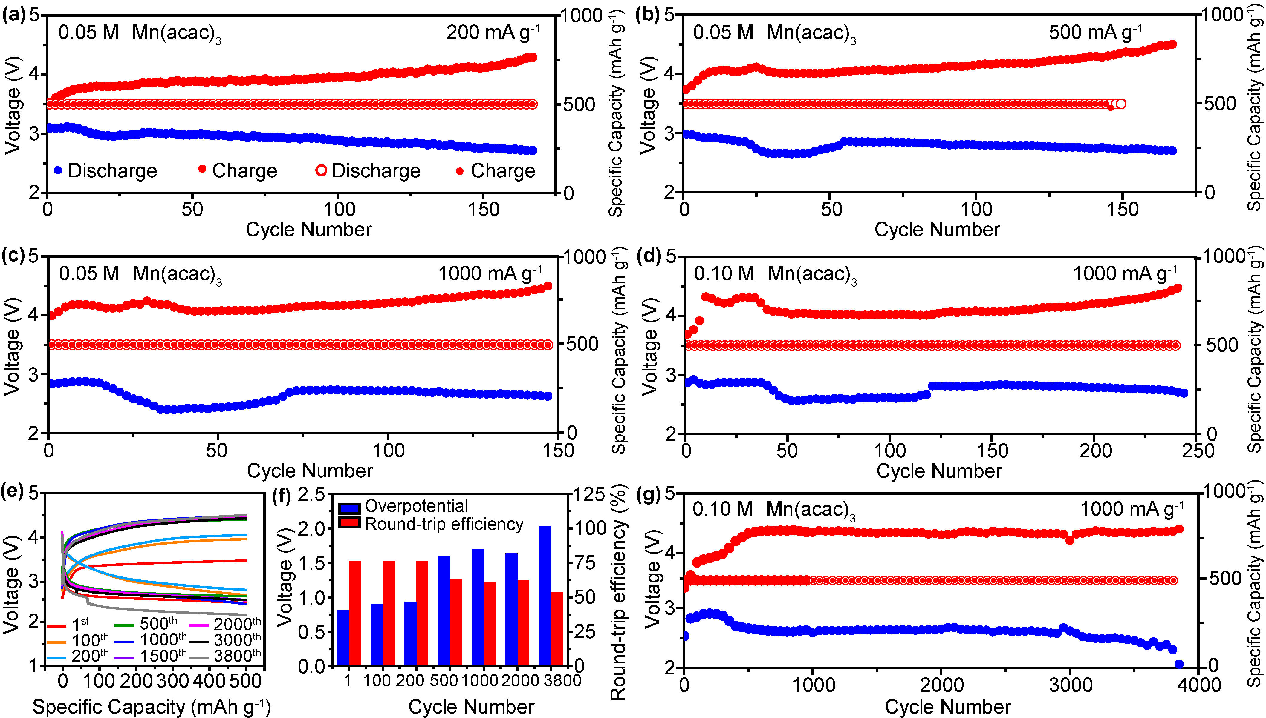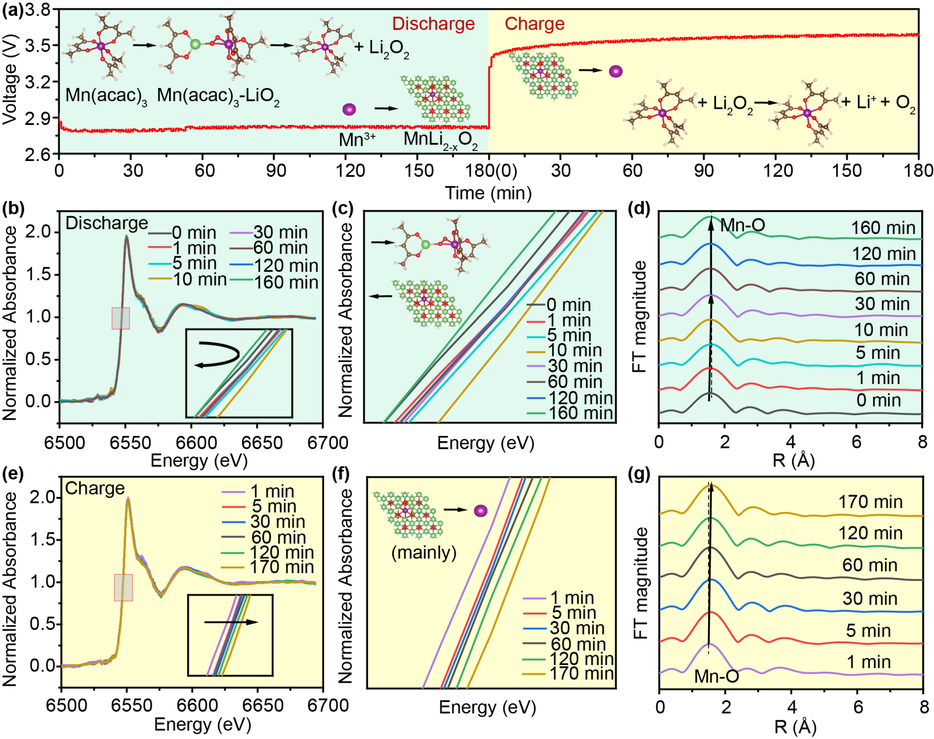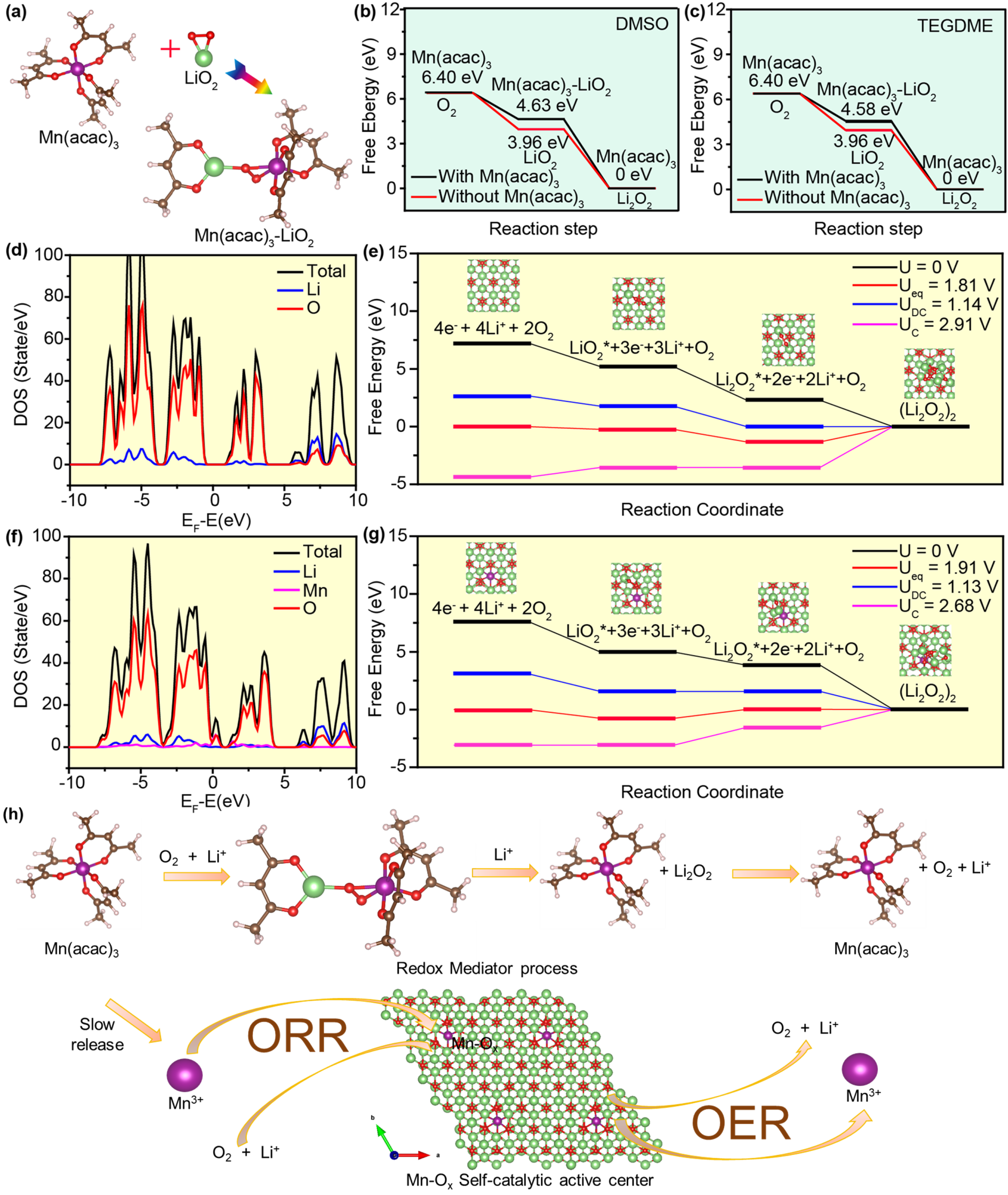 基于此,51吃瓜 孙根班教授团队提出了一种自催化与氧化还原媒介协同耦合的超长循环寿命的锂空气电池体系。采用具有弱电解质性质的有机金属盐作为双功能添加剂,耦合自催化体系与中间产物反应路径的优化,使乙酰丙酮盐在Li-O2电池中表现出作为过渡金属阳离子和氧化还原介质的双重特性。如图1所示,在Mn3+和Mn(acac)3分子共存的情况下,金属离子可以通过原位电化学植入法,经过还原后,掺杂进入Li2O2,形成放电产物Mn-Li2-xO2,从而改变其绝缘性能。此外,有机金属盐作为液相氧化还原介质(RMs),有效捕获和稳定中间相LiO2,形成复杂结构Mn(acac)3-LiO2,在充电过程中不仅能够稳定中间体LiO2,还能促进中间体进一步转化生成Li2O2,并增强分解反应,这一点通过原位同步辐射和紫外可见光谱得到进一步证实。含有Mn(acac)3的Li-O2电池显示出0.43 V的超低过电位,并在1000 mA g-1下能够维持250次长循环。如图2所示,当结合反应环境优化策略,可在1000 mA g-1下实现3850次的长循环稳定性。通过理论计算模拟,提出了利用Mn(acac)3的Li-O2电池的ORR和OER机制。如图3所示,揭示了氧化还原介质的作用以及基于分子形式Mn(acac)3和电化学植入的活性Mn-Ox簇的自催化反应机制,进一步证实了自催化体系与氧化还原媒介协同耦合的机理,为设计先进的超长寿命锂氧气电池系统和提高其电池关键性能提供了新的见解。