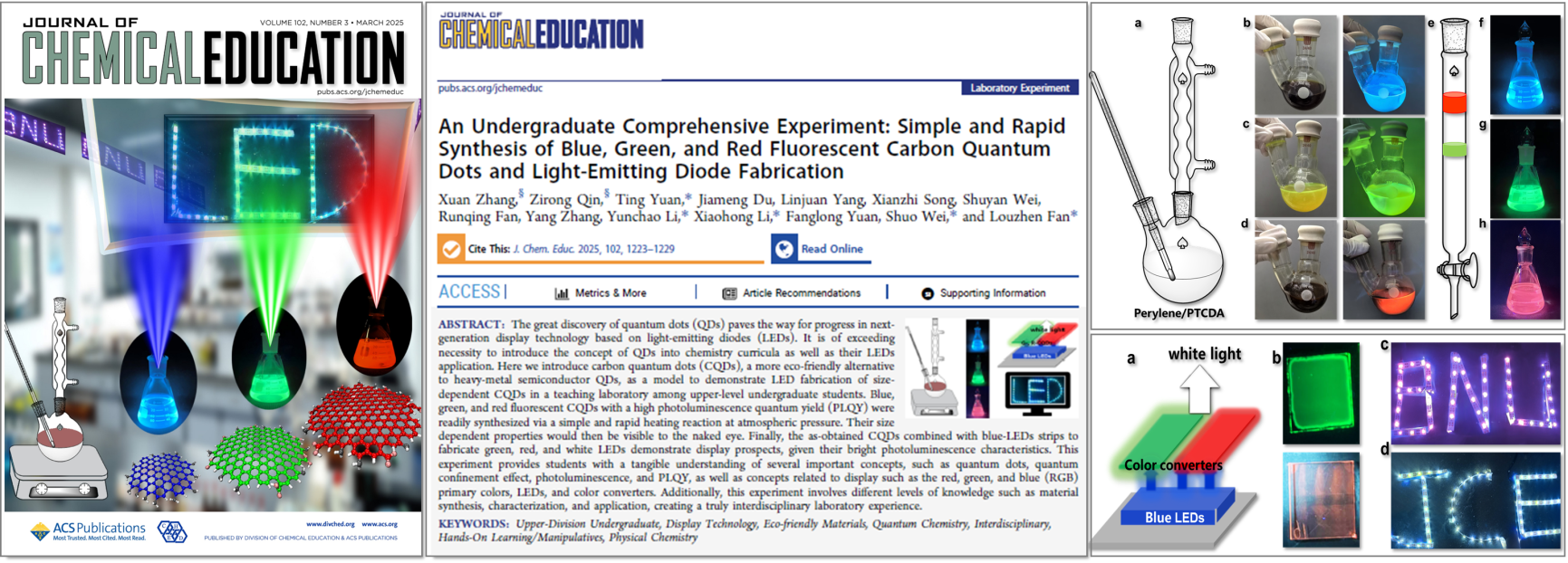 近日,我校51吃瓜 实验教学中心指导本科生以第一作者身份在国际化学教育顶级期刊《Journal of Chemical Education》(JCE)发表实验教学论文:“An Undergraduate Comprehensive Experiment: Simple and Rapid Synthesis of Blue, Green, and Red Fluorescent Carbon Quantum Dots and Light-Emitting Diode Fabrication” (J. Chem. Educ. 2025, 102, 1223−1229),并入选当期封面(Supplementary Cover)。JCE是美国化学会(ACS)旗下全球化学教育首屈一指的期刊,该论文的发表实现了我校本科化学实验教学类论文在国际教育类顶级期刊零的突破。