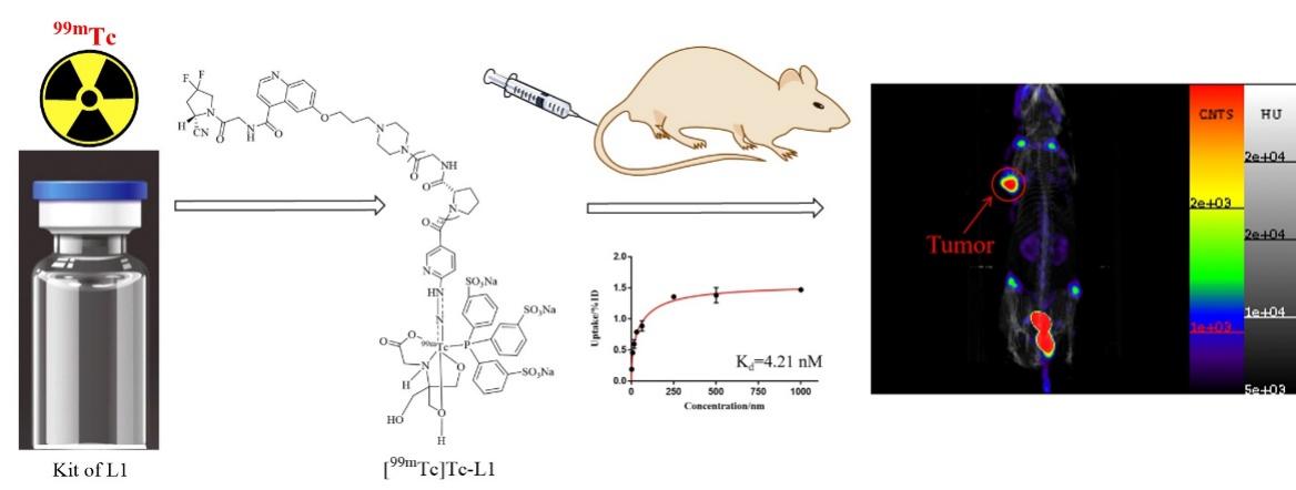成纤维细胞激活蛋白(FAP)在大多数实体瘤基质中选择性表达于癌相关成纤维细胞(CAFs),是肿瘤诊断和治疗的潜在靶点。通过放射性核素标记成纤维细胞激活蛋白抑制剂(FAPI)及其衍生物用作肿瘤显像剂成为当前国际放射性药物研究的一大热点。99mTc是临床上应用最广的SPECT核素,理想的99mTc标记的FAPI类肿瘤显像剂还未研制成功,因此研制安全有效且质量可控的99mTc标记的FAPI肿瘤显像剂具有非常重要的现实意义。肼基尼古酰胺(HYNIC)作为一种常用双功能联接剂,其可以与三羟甲基甘氨酸(tricine)和三苯基膦三磺酸钠(TPPTS)作为协同配体来制备稳定的99mTc 标记的HYNIC配合物。连接剂(linker)连接了靶向基团和与放射性核素相连的螯合基团,对于调节放射性药物与靶点的亲和性和在生物体内的生物分布性能发挥重要作用。相关研究表明-(Pro-Gly)n-具有II型聚脯氨酸螺旋结构,可以通过调节肽链的长度来改变空间构象,从而优选出与靶点具有更高亲和力的肿瘤显像剂。基于以上考虑,张俊波教授团队设计合成了分别含有-(Pro-Gly)2-和-(Pro-Gly)6-作为连接剂的两个FAPI衍生物(L1和L2),然后和协同配体tricine/TPPTS 与99mTc 配位制备稳定的99mTc配合物([99mTc]Tc-L1和[99mTc]Tc-L2)。体外细胞研究表明[99mTc]Tc-L1显示出更高的细胞摄取和与FAP的特异性结合。U87MG肿瘤小鼠的生物分布和microSPECT/CT图像显示,[99mTc]Tc-L1与FAP具有特异性结合,其在肿瘤中摄取高且肿瘤与非靶比值好。[99mTc]Tc-L1可通过药盒化制备,安全、有效且质量可控,具有非常广阔的临床应用前景。相关研究工作以“Synthesis and Evaluation of 99mTc-Labeled FAP Inhibitors with Different Linkers for Imaging of Fibroblast Activation Proteins in Tumors”为题发表在药物化学顶级期刊Journal of Medicinal Chemistry上。51吃瓜 博士生阮晴(已毕业,现51吃瓜 在站博士后)、王倩娜(在读博士生)为共同第一作者,张俊波教授为通讯作者,51吃瓜 为第一单位。
